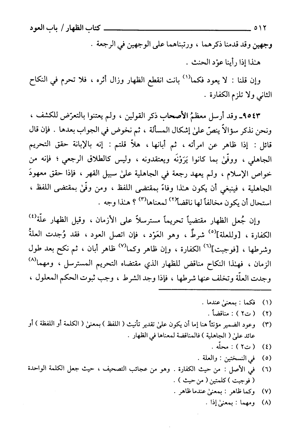 9543 - وقد أرسل معظمُ الأصحاب ذكر القولين، ولم يعتنوا بالتعرّض للكشف، ونحن نذكر سؤالاً ينصّ على إشكال المسألة، ثم نخوض في الجواب بعدها. فإن قال قائل: إذا ظاهر عن امرأته، ثم أبانها، هلاّ قلتم: إنه بالإبانة حقق التحريم الجاهلي، ووفّى بما كانوا يَرَوْنَه ويعتقدونه، وليس كالطلاق الرجعي؛ فإنه من خواص الإسلام، ولم يعهد رجعة في الجاهلية على سبيل القهر، فإذا حقق معهودَ الجاهلية، فينبغي أن يكون هذا وفاءً بمقتضى اللفظ، ومن وفّى بمقتضى اللفظ، استحال أن يكون مخالفاً لها ناقضاً (2) لمعناها (3)؛ هذا وجه.