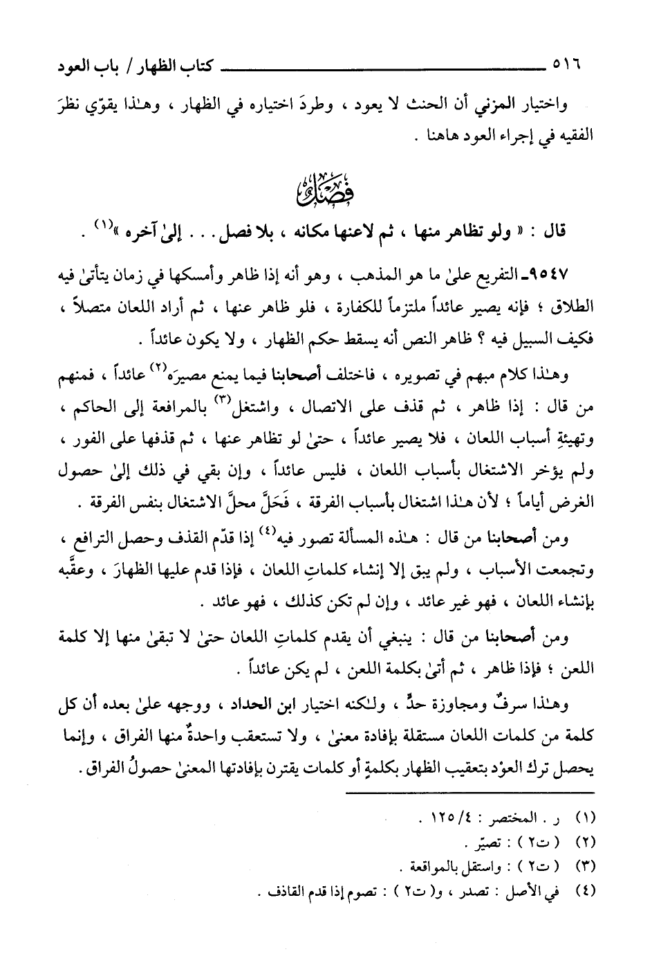وهذا سرفٌ ومجاوزة حدٍّ، ولكنه اختيار ابن الحداد، ووجهه على بعده أن كل كلمة من كلمات اللعان مستقلة بإفادة معنى، ولا تستعقب واحدةٌ منها الفراق، وإنما يحصل ترك العوْد بتعقيب الظهار بكلمةٍ أو كلمات يقترن بإفادتها المعنى حصولٌ الفراق.