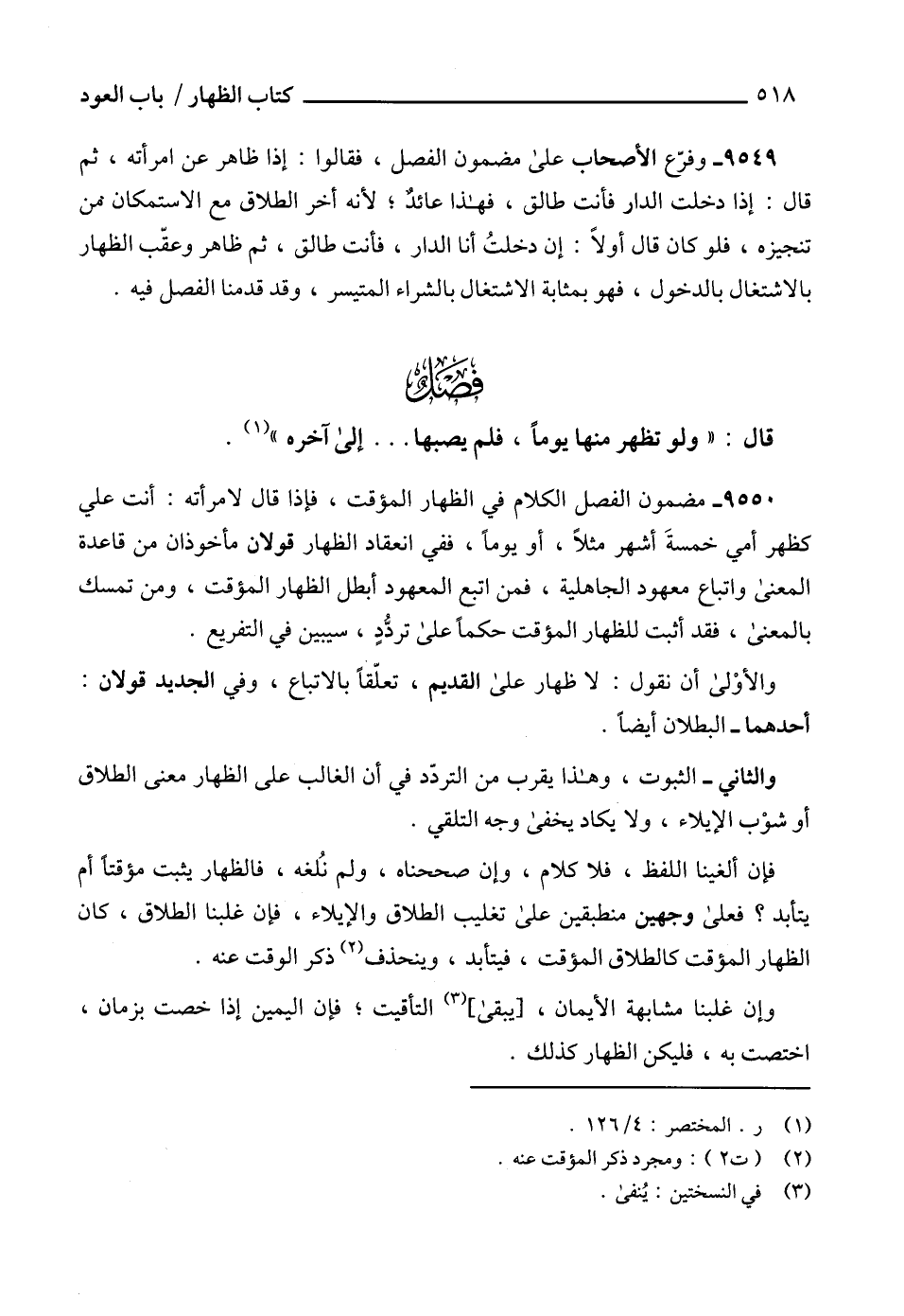 9550 - مضمون الفصل الكلام في الظهار المؤقت، فإذا قال لامرأته: أنت علي كظهر أمي خمسةَ أشهر مثلاً، أو يوماً، ففي انعقاد الظهار قولان مأخوذان من قاعدة المعنى واتباع معهود الجاهلية، فمن اتبع المعهود أبطل الظهار المؤقت، ومن تمسك بالمعنى، فقد أثبت للظهار المؤقت حكماً على تردُّدٍ، سيبين في التفريع.
