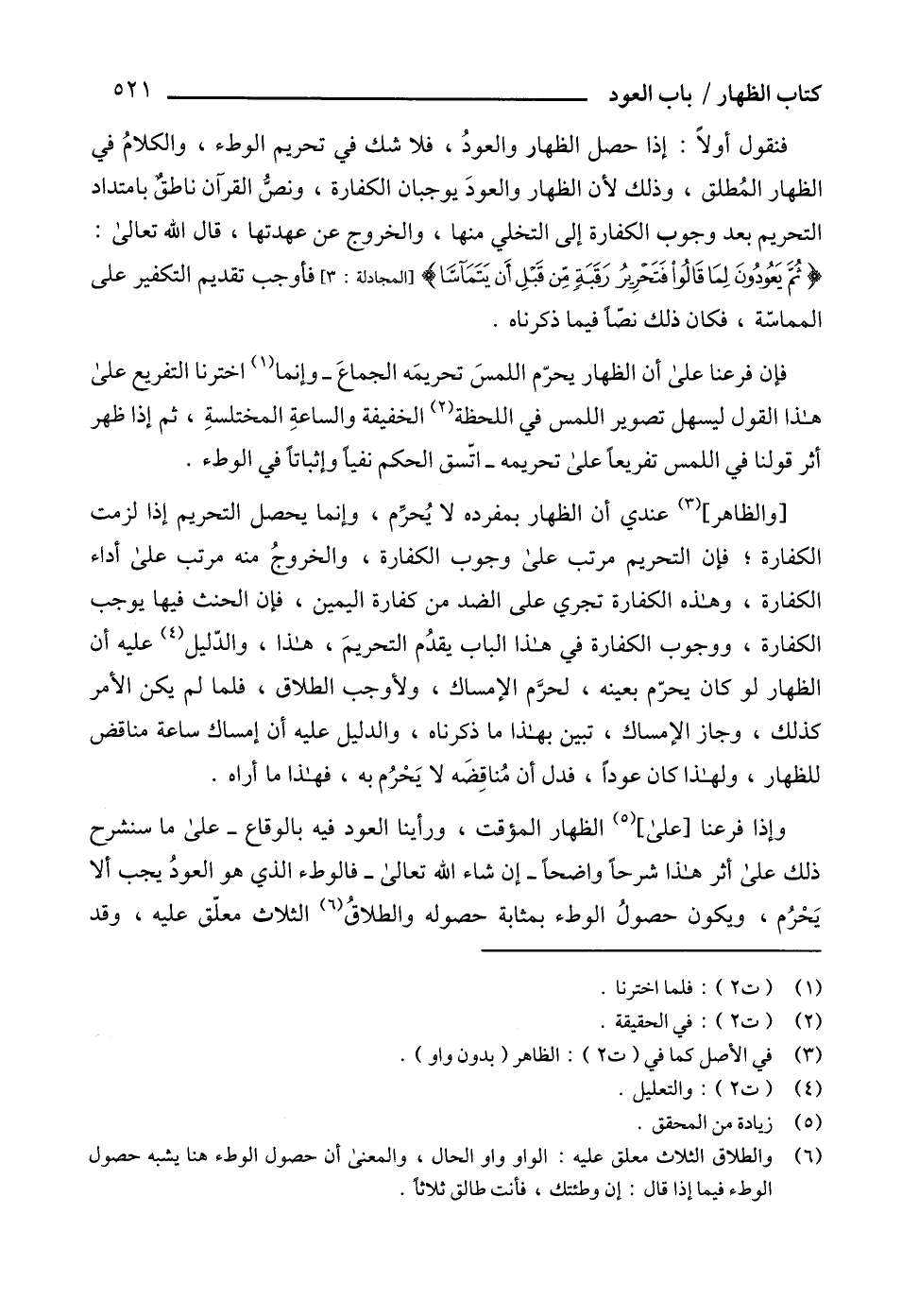 فنقول أولاً: إذا حصل الظهار والعودُ، فلا شك في تحريم الوطء، والكلامُ في الظهار المُطلق، وذلك لأن الظهار والعودَ يوجبان الكفارة، ونصُّ القرآن ناطقٌ بامتداد التحريم بعد وجوب الكفارة إلى التخلي منها، والخروج عن عهدتها، قال الله تعالى: {ثُمَّ يَعُودُونَ لِمَا قَالُوا فَتَحْرِيرُ رَقَبَةٍ مِنْ قَبْلِ أَنْ يَتَمَاسَّا} [المجادلة: 3] فأوجب تقديم التكفير على المماسّة، فكان ذلك نصّاً فيما ذكرناه.