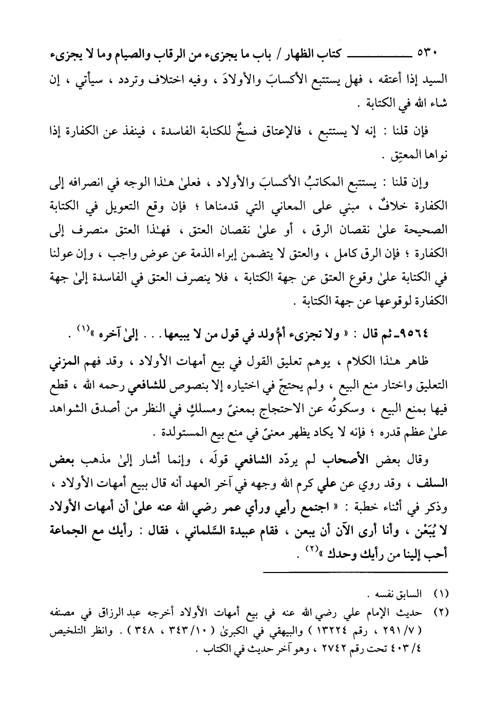 (2) حديث الإمام علي رضي الله عنه في بيع أمهات الأولاد أخرجه عبد الرزاق في مصنفه (7/ 291، رقم 13224) والبيهقي في الكبرى (10/ 343، 348). وانظر التلخيص 4/ 403 تحت رقم 2742، وهو آخر حديث في الكتاب.