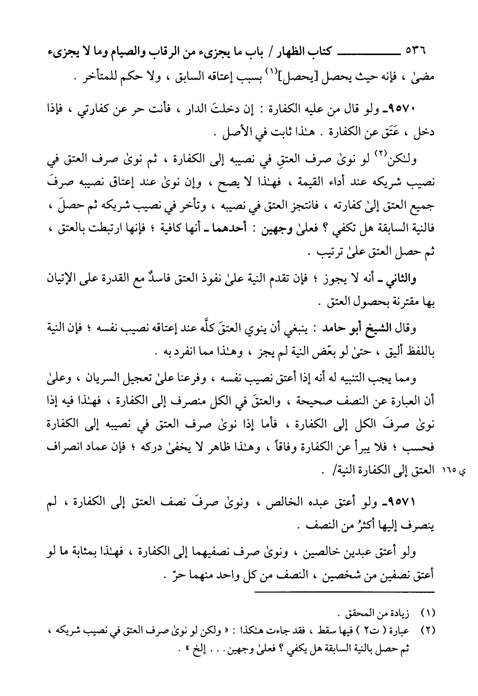 9571 - ولو أعتق عبده الخالص، ونوى صرفَ نصف العتق إلى الكفارة، لم ينصرف إليها أكثرُ من النصف.