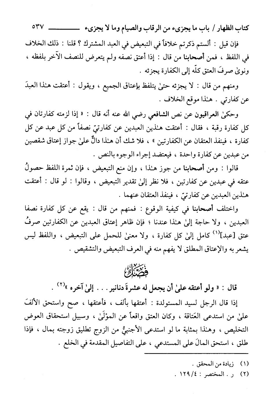 قالوا: ومن أصحابنا من جوز هذا، وإن منع التبعيض، فإن ثمرة اللفظ حصولُ عتقه في عبدين عن كفارتين، فلا نظر إلى تقدير التبعيض، وقالوا: لو قال: أعتقت هذين العبدين عن كفارتيّ، فينفذ العتقان عنهما.