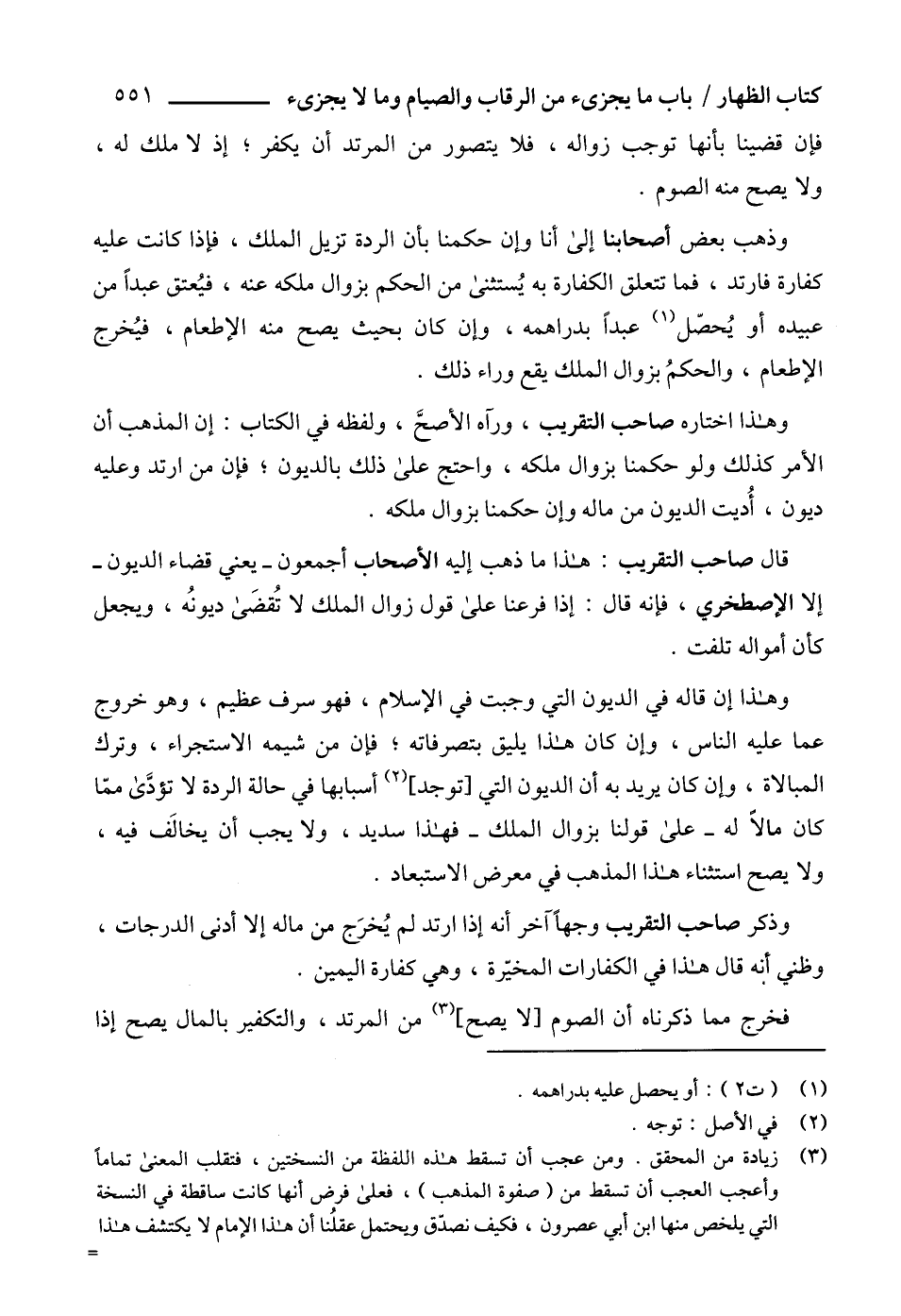 (3) زيادة من المحقق. ومن عجب أن تسقط هذه اللفظة من النسختين، فتقلب المعنى تماماً وأعجب المعجب أن تسقط من (صفوة المذهب)، فعلى فرض أنها كانت ساقطة في النسخة التي يلخص منها ابن أبي عصرون، فكيف نصدّق ويحتمل عقلُنا أن هذا الإمام لا يكتشف هذا =