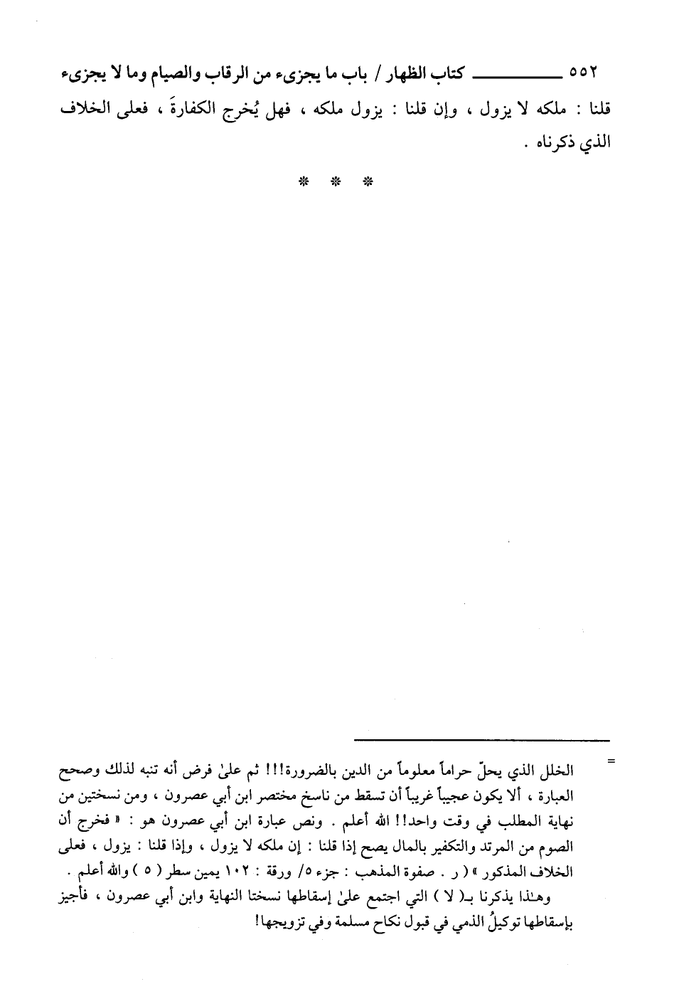 = الخلل الذي يحلّ حراماً معلوماً من الدين بالضرورة!!! ثم على فرض أنه تنبه لذلك وصحح العبارة، ألا يكون عجيباً غريباً أن تسقط من ناسخ مختصر ابن أبي عصرون، ومن نسختين من نهاية المطلب في وقت واحد!! الله أعلم. ونص عبارة ابن أبي عصرون هو: "فخرج أن الصوم من المرتد والتكفير بالمال يصح إذا قلنا: إن ملكه لا يزول، واذا قلنا: يزول، فعلى الخلاف المذكور" (ر. صفوة المذهب: جزء 5/ورقة: 102 يمين سطر (5) والله أعلم.