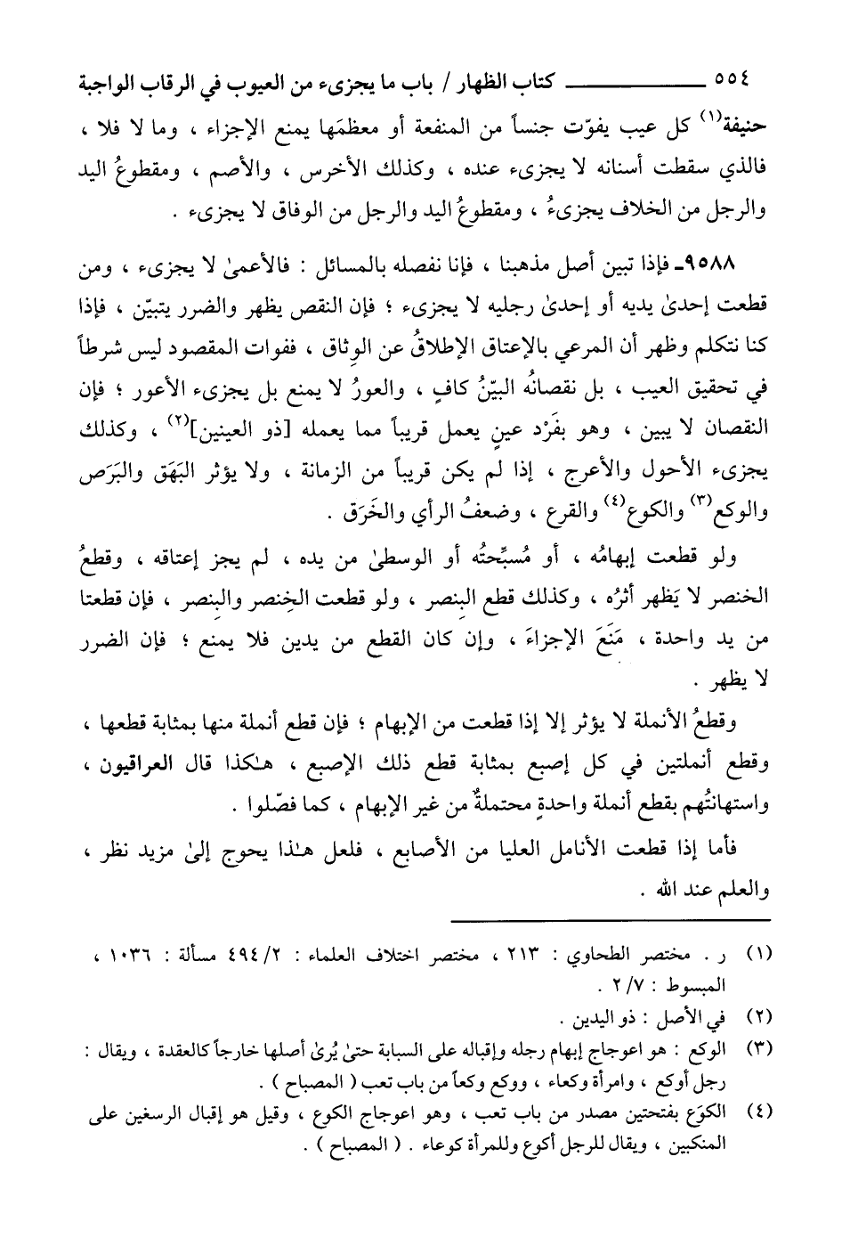 9588 - فإذا تبين أصل مذهبنا، فإنا نفصله بالمسائل: فالأعمى لا يجزىء، ومن قطعت إحدى يديه أو إحدى رجليه لا يجزىء؛ فإن النقص يظهر والضرر يتبيّن، فإذا كنا نتكلم وظهر أن المرعي بالإعتاق الإطلاقُ عن الوِثاق، ففوات المقصود ليس شرطاً في تحقيق العيب، بل نقصانُه البيّنُ كافٍ، والعورُ لا يمنع بل يجزىء الأعور؛ فإن النقصان لا يبين، وهو بفَرْد عينٍ يعمل قريباً مما يعمله [ذو العينين] (2)، وكذلك يجزىء الأحول والأعرج، إذا لم يكن قريباً من الزمانة، ولا يؤثر البَهَق والبَرَص والوكع (3) والكوع (4) والقرع، وضعفُ الرأي والخَرَق.