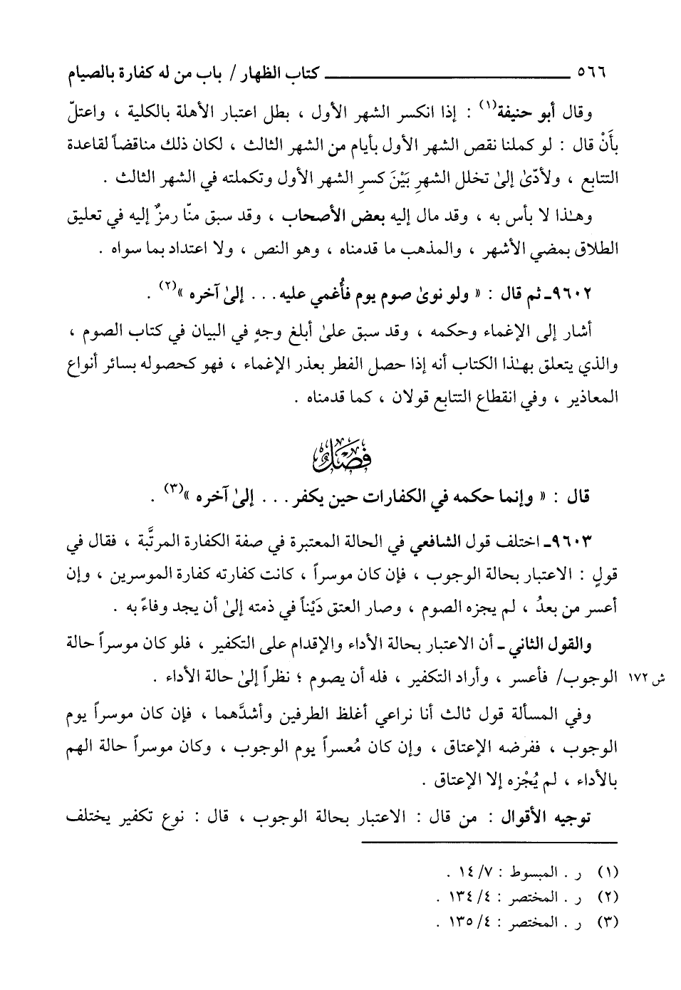 9603 - اختلف قول الشافعي في الحالة المعتبرة في صفة الكفارة المرتَّبة، فقال في قولٍ: الاعتبار بحالة الوجوب، فإن كان موسراً، كانت كفارته كفارة الموسرين، وإن أعسر من بعدُ، لم يجزه الصوم، وصار العتق دَيْناً في ذمته إلى أن يجد وفاءً به.