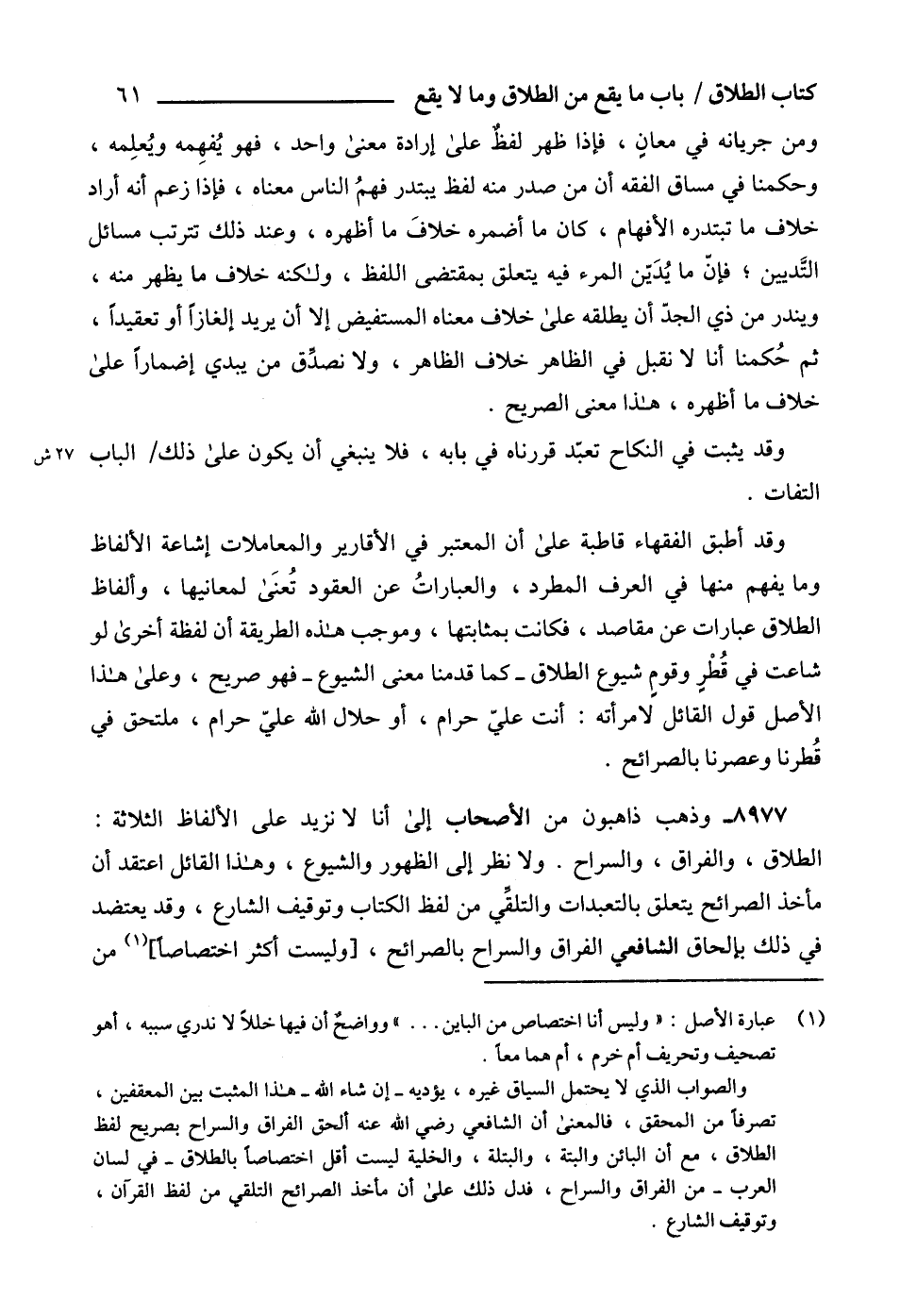 والصواب الذي لا يحتمل السياق غيره، يؤديه -إن شاء الله- هذا المثبت بين المعقفين، تصرفاً من المحقق، فالمعنى أن الشافعي رضي الله عنه ألحق الفراق والسراح بصريح لفظ الطلاق، مع أن البائن والبتة، والبتلة، والخلية ليست أقل اختصاصاً بالطلاق -في لسان العرب- من الفراق والسراح، فدل ذلك على أن مأخذ الصرائح التلقي من لفظ القرآن، وتوقيف الشارع.
