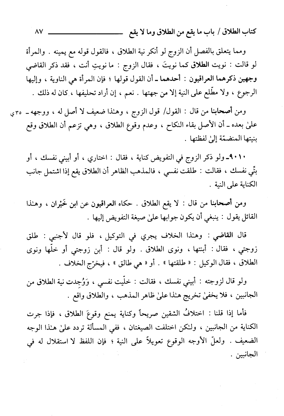 9010 - ولو ذكر الزوج في التفويض كناية، فقال: اختاري، أو أبيني نفسك، أو بتِّي نفسك، فقالت: طلقت نفسي، فالمذهب الظاهر أن الطلاق يقع إذا اشتمل جانب الكناية على النية.