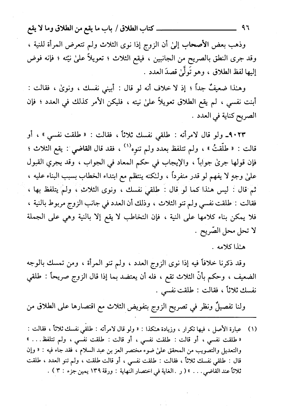 والتعديل والتصويب من المحقق على ضوء مختصر العز بن عبد السلام، فقد جاء فيه: "وإن قال: طلقي نفسك ثلاثاًَ، فقالت: طلقت نفسي، أو قالت طلقت، ولم تنو العدد، طلقت ثلاثاً عند القاضي ... " (ر. الغاية في اختصار النهاية: ورقة 139 يمين جزء: 3).