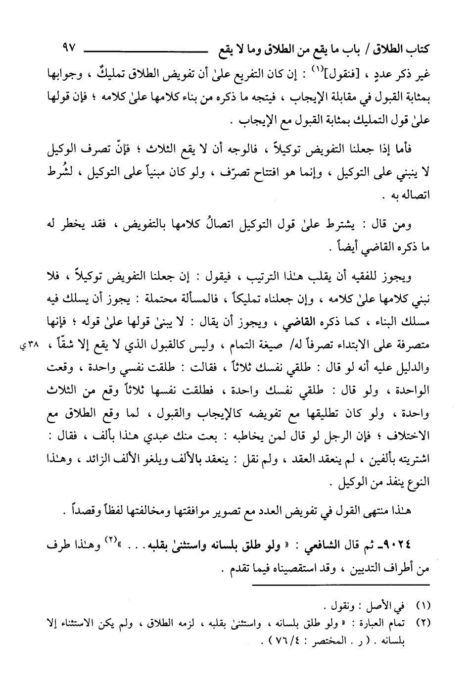(2) تمام العبارة: "ولو طلق بلسانه، واستثنى بقلبه، لزمه الطلاق، ولم يكن الاستثناء إلا بلسانه. (ر. المختصر: 4/ 76).