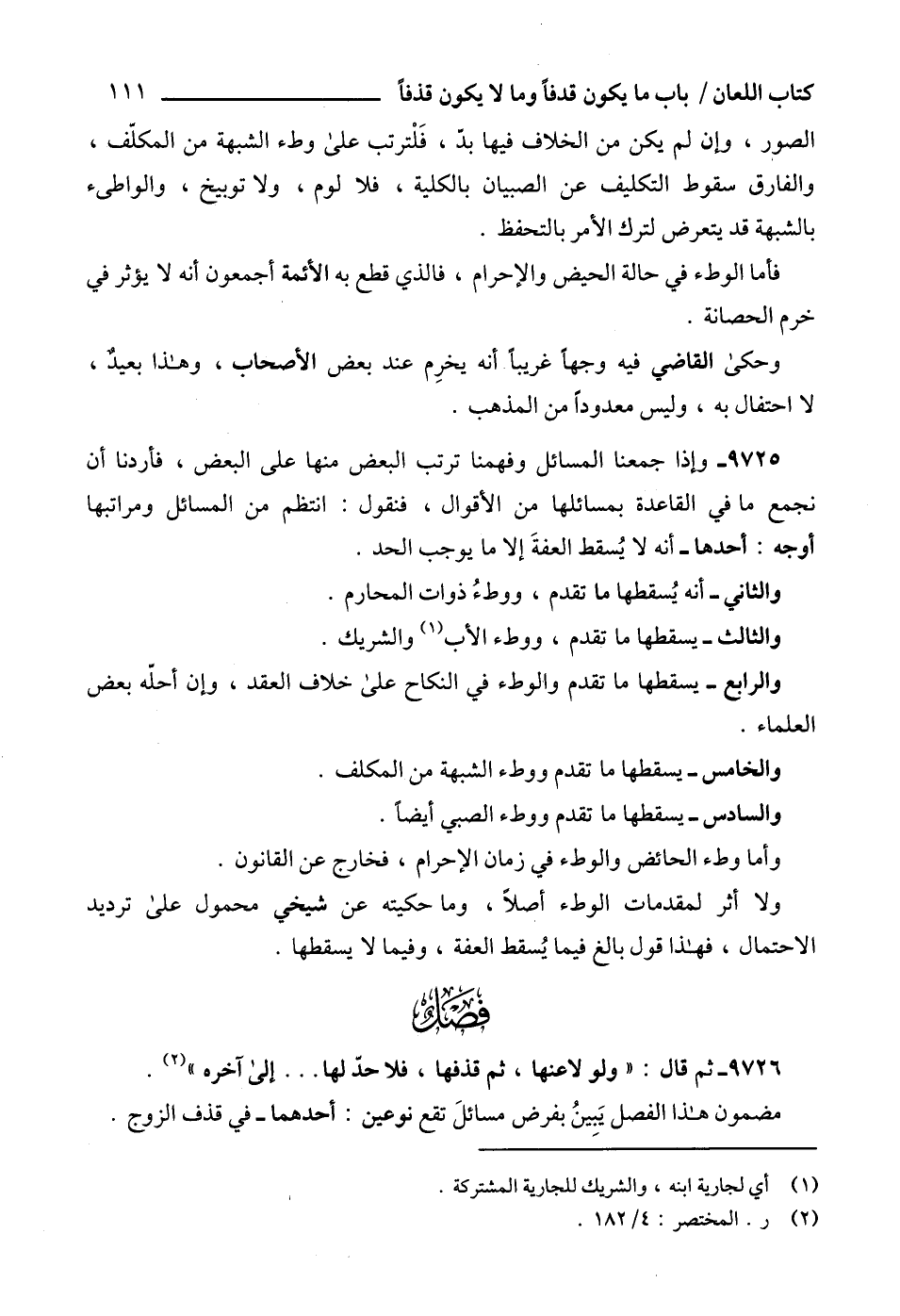 9725 - وإذا جمعنا المسائل وفهمنا ترتب البعض منها على البعض، فأردنا أن نجمع ما في القاعدة بمسائلها من الأقوال، فنقول: انتظم من المسائل ومراتبها أوجه: أحدها - أنه لا يُسقط العفةَ إلا ما يوجب الحد.