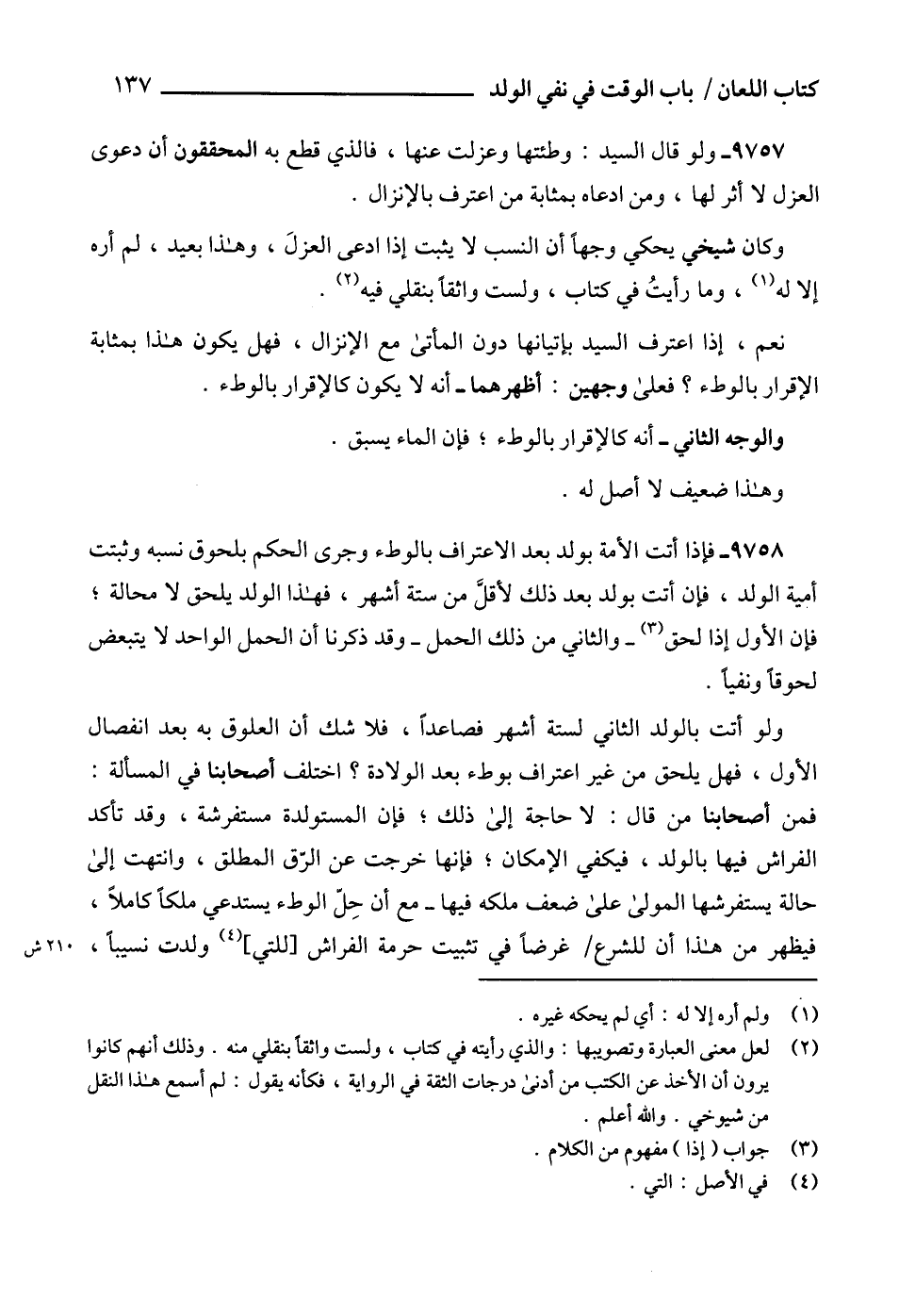 9757 - ولو قال السيد: وطئتها وعزلت عنها، فالذي قطع به المحققون أن دعوى العزل لا أثر لها، ومن ادعاه بمثابة من اعترف بالإنزال.