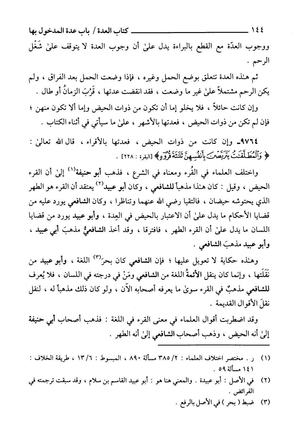 واختلف العلماء في القُرء ومعناه في الشرع، فذهب أبو حنيفة (1) إلى أن القرء الحيض، وقيل: كان هذا مذهباً للشافعي، وكان أبو عبيد (2) يعتقد أن القرء هو الطهر الذي يحتوشه حيضان، فالتقيا رضي الله عنهما وتناظرا، وكان الشافعي يورد عليه من قضايا الأحكام ما يدل على أن الاعتبار بالحيض في العِدة، وأبو عبيد يورد من قضايا اللسان ما يدل على أن القرء الطهر، فافترقا، وقد أخذ الشافعيُّ مذهبَ أبي عبيد، وأبو عبيد مذهبَ الشافعي.