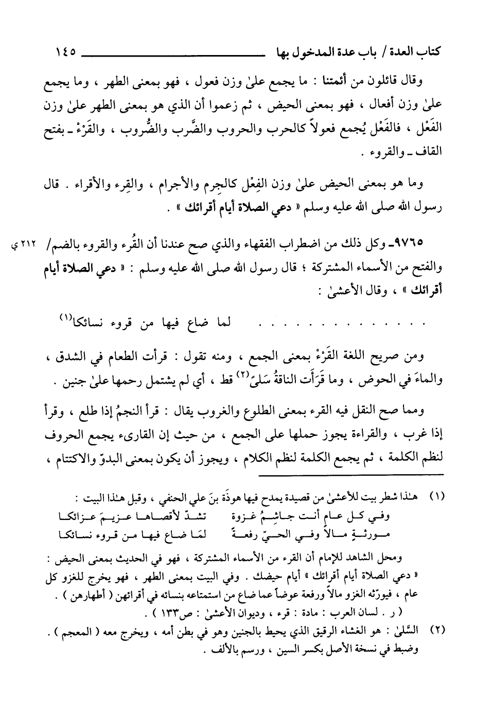 9765 - وكل ذلك من اضطراب الفقهاء والذي صح عندنا أن القُرء والقروء بالضم والفتح من الأسماء المشتركة؛ قال رسول الله صلى الله عليه وسلم: " دعي الصلاة أيام أقرائك "، وقال الأعشى: