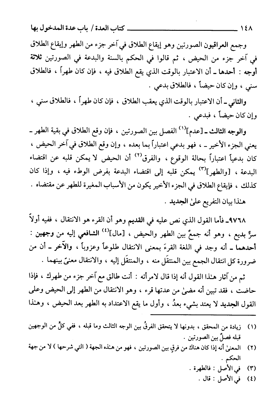 وجمع العراقيون الصورتين وهو إيقاع الطلاق في آخر جزء من الطهر وإيقاع الطلاق في آخر جزء من الحيض، ثم قالوا في الحكم بالسنة والبدعة في الصورتين ثلاثة أوجه: أحدها - أن الاعتبار بالوقت الذي يقع الطلاق فيه، فإن كان طهراً، فالطلاق سني، وإن كان حيضاً، فالطلاق بدعي.