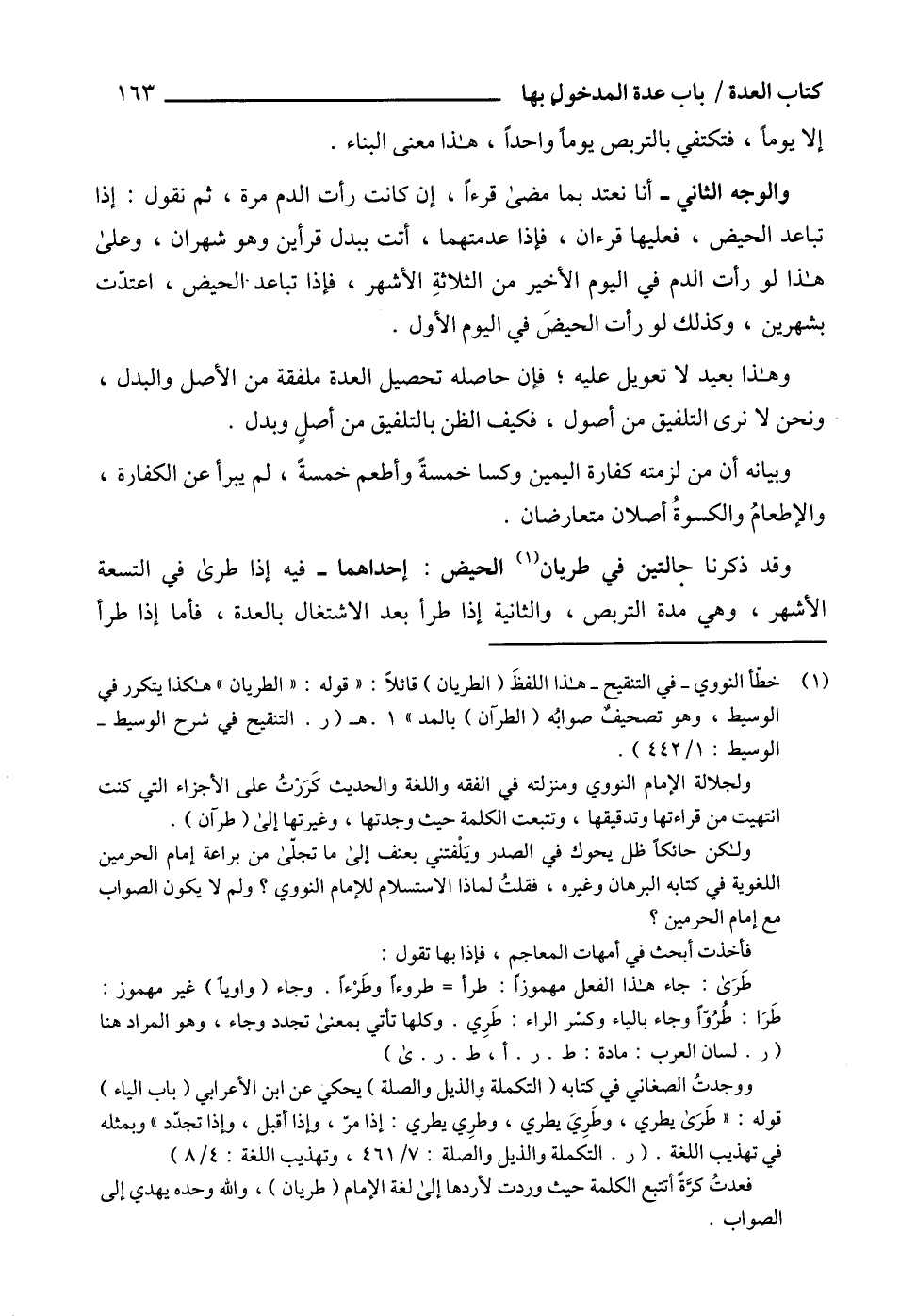 (1) خطّأ النووي -في التنقيح- هذا اللفظَ (الطريان) قائلاً: " قوله: " الطريان " هكذا يتكرر في الوسيط، وهو تصحيفٌ صوابُه (الطرآن) بالمد " ا. هـ (ر. التنقيح في شرح الوسيط- الوسيط: 1/ 442).