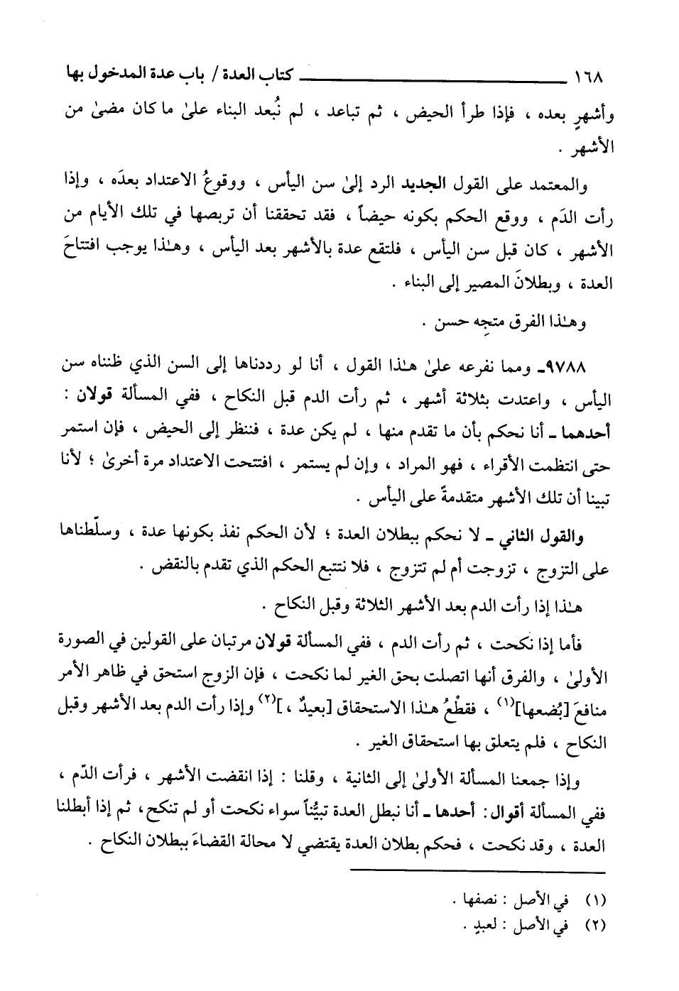 9788 - ومما نفرعه على هذا القول، أنا لو رددناها إلى السن الذي ظنناه سن اليأس، واعتدت بثلاثة أشهر، ثم رأت الدم قبل النكاح، ففي المسألة قولان: أحدهما - أنا نحكم بأن ما تقدم منها، لم يكن عدة، فننظر إلى الحيض، فإن استمر حتى انتظمت الأقراء، فهو المراد، وإن لم يستمر، افتتحت الاعتداد مرة أخرى؛ لأنا تبينا أن تلك الأشهر متقدمةً على اليأس.