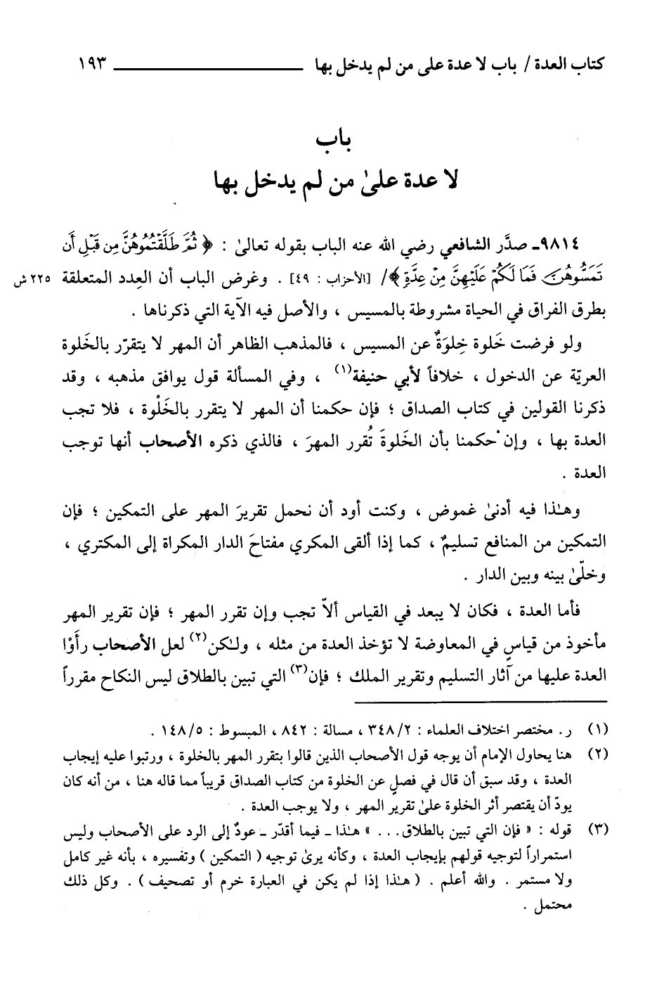 9814 - صدَّر الشافعي رضي الله عنه الباب بقوله تعالى: {ثُمَّ طَلَّقْتُمُوهُنَّ مِنْ قَبْلِ أَنْ تَمَسُّوهُنَّ فَمَا لَكُمْ عَلَيْهِنَّ مِنْ عِدَّةٍ} [الأحزاب: 49]. وغرض الباب أن العِدد المتعلقة بطرق الفراق في الحياة مشروطة بالمسيس، والأصل فيه الآية التي ذكرناها.