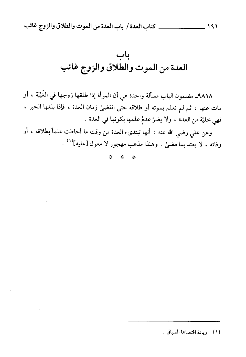 9818 - مضمون الباب مسألة واحدة هي أن المرأة إذا طلقها زوجها في الغَيْبَة، أو مات عنها، ثم لم تعلم بموته أو طلاقه حتى انقضى زمان العدة، فإذا بلغها الخبر، فهي خليّة من العدة، ولا يضرّ عدمُ علمها بكونها في العدة.