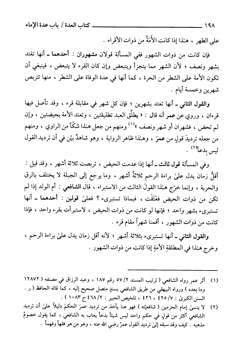 والقول الثاني - أنها تعتد بشهرين؛ فإن كل شهر في مقابلة قرء، وقد تأصل فيها قرءان، وروي عن عمر أنه قال: " يطلِّق العبد تطليقتين، وتعتد الأمة بحيضتين، وإن لم تحض، فشهران أو شهر ونصف " (1) ومنهم من جعل هذا شكّاً من الراوي، ومنهم من جعله ترديدَ قولٍ من عمرَ، وهذا ظاهر الرواية، وهو شاهدٌ بيّن في أن ترديد القول ليس بِدعاً (2).