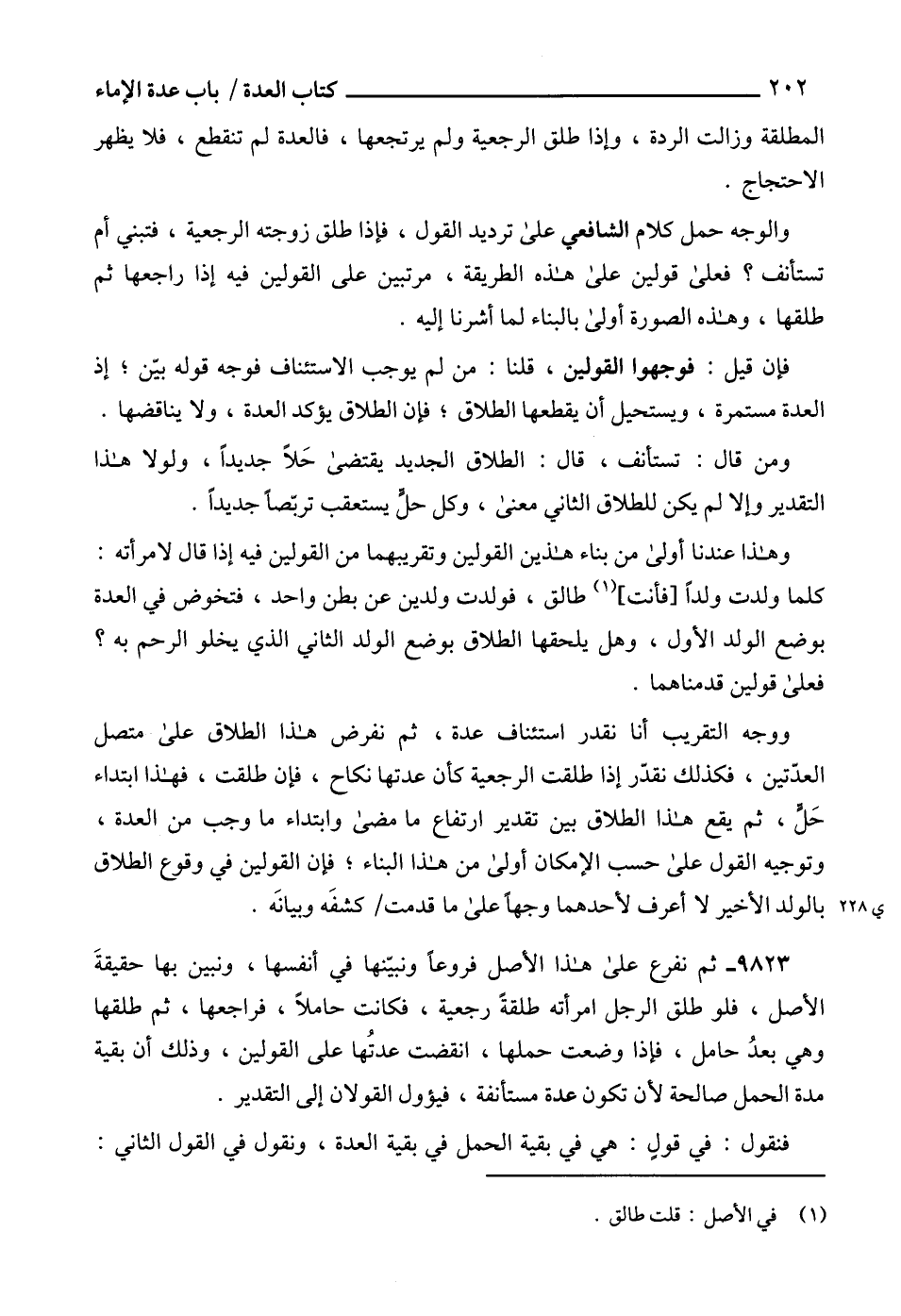 9823 - ثم نفرع على هذا الأصل فروعاً ونبيّنها في أنفسها، ونبين بها حقيقةَ الأصل، فلو طلق الرجل امرأته طلقةً رجعية، فكانت حاملاً، فراجعها، ثم طلقها وهي بعدُ حامل، فإذا وضعت حملها، انقضت عدتُها على القولين، وذلك أن بقية مدة الحمل صالحة لأن تكون عدة مستأنفة، فيؤول القولان إلى التقدير.