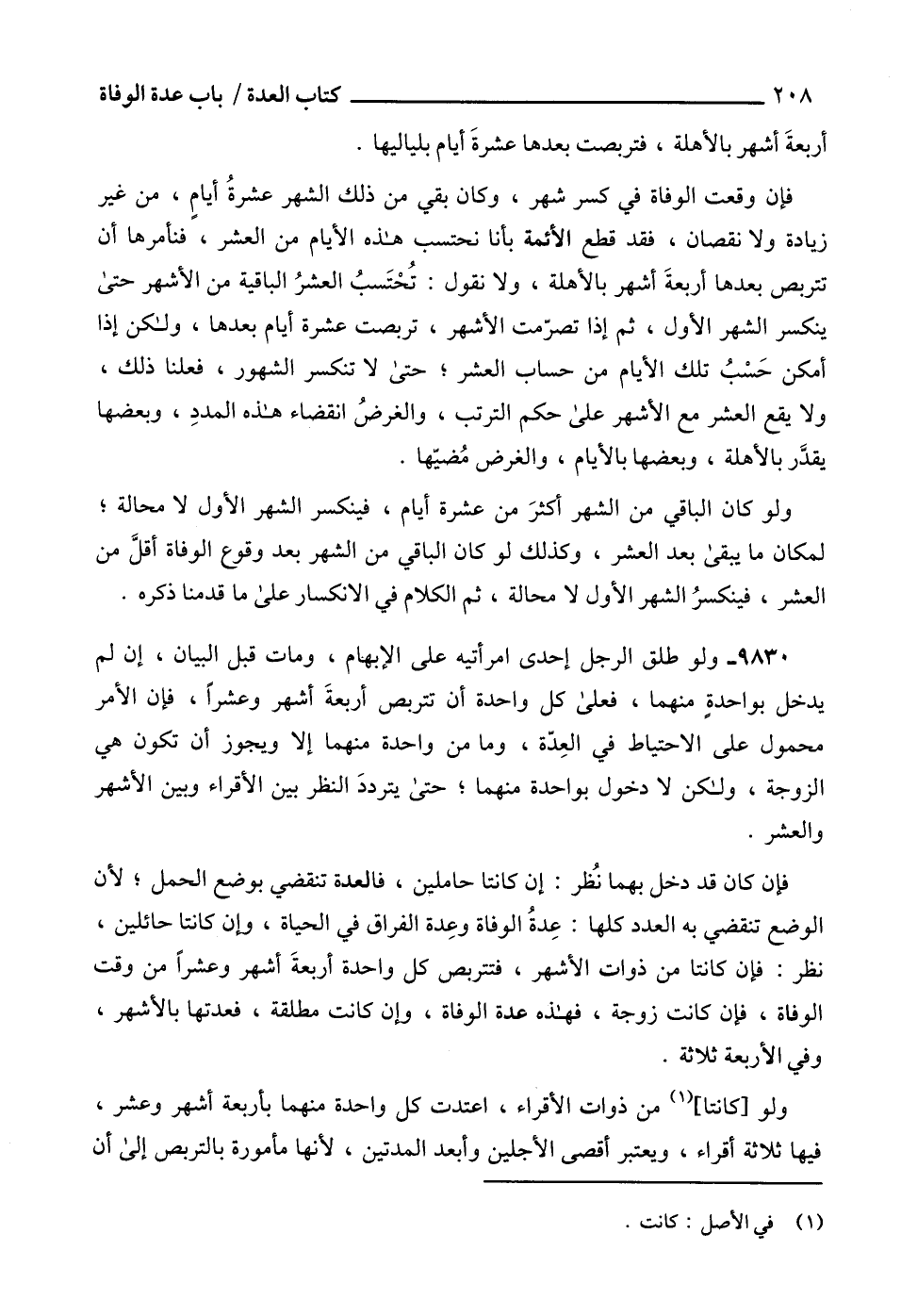 9830 - ولو طلق الرجل إحدى امرأتيه على الإبهام، ومات قبل البيان، إن لم يدخل بواحدةٍ منهما، فعلى كل واحدة أن تتربص أربعةَ أشهر وعشراً، فإن الأمر محمول على الاحتياط في العِدّة، وما من واحدة منهما إلا ويجوز أن تكون هي الزوجة، ولكن لا دخول بواحدة منهما؛ حتى يترددَ النظر بين الأقراء وبين الأشهر والعشر.