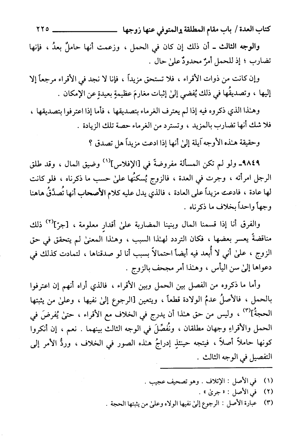 وأما ما ذكروه من الفصل بين الحمل وبين الأقراء، فالذي أراه أنهم إن اعترفوا بالحمل، فالأصلُ عدمُ الولادة قطعاً، ويتعين [الرجوع إلى نفيها، وعلى من يثبتها الحجةُ] (3)، وليس من حق هذا أن يدرج في الخلاف مع الأقراء، حتى يُفرضَ في الحمل والأقراءِ وجهان مطلقان، ونُفصِّلَ في الوجه الثالث بينهما. نعم، إن أنكروا كونها حاملاً أصلاً، فيتجه حينئذٍ إدراجُ هذه الصور في الخلاف، وردُّ الأمر إلى التفصيل في الوجه الثالث.