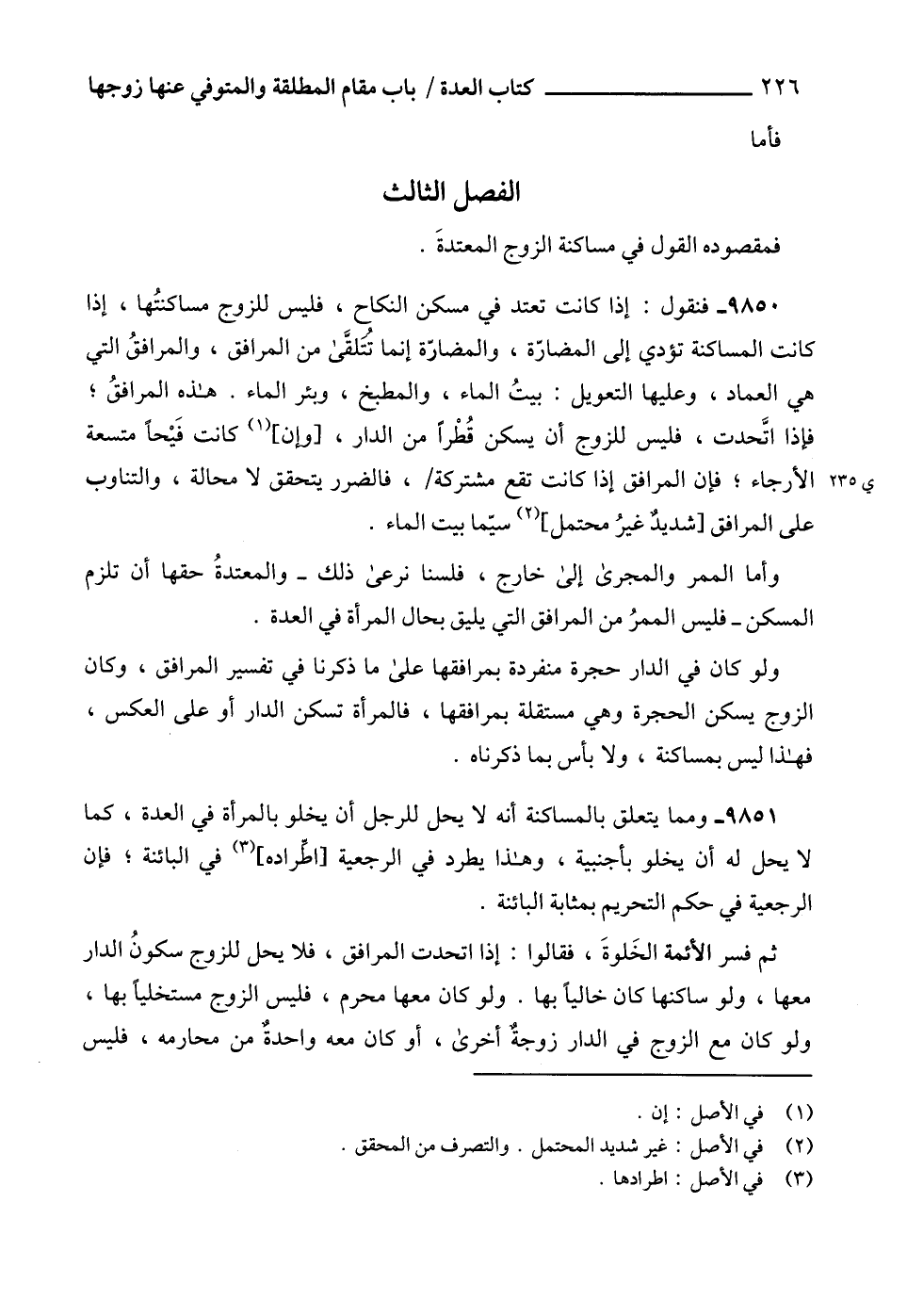 9851 - ومما يتعلق بالمساكنة أنه لا يحل للرجل أن يخلو بالمرأة في العدة، كما لا يحل له أن يخلو بأجنبية، وهذا يطرد في الرجعية [اطِّراده] (3) في البائنة؛ فإن الرجعية في حكم التحريم بمثابة البائنة.
