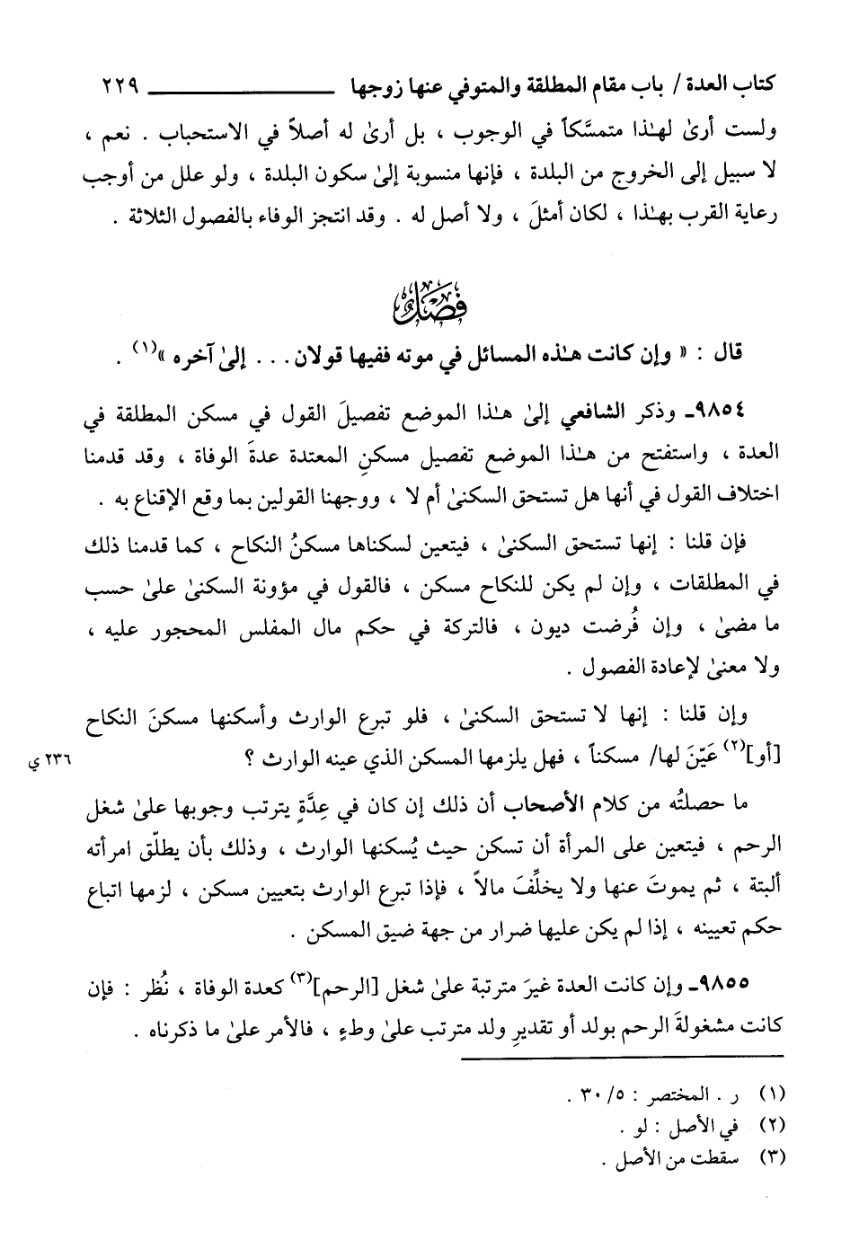 9854 - وذكر الشافعي إلى هذا الموضع تفصيلَ القول في مسكن المطلقة في العدة، واستفتح من هذا الموضع تفصيل مسكنِ المعتدة عدةَ الوفاة، وقد قدمنا اختلاف القول في أنها هل تستحق السكنى أم لا، ووجهنا القولين بما وقع الإقناع به.