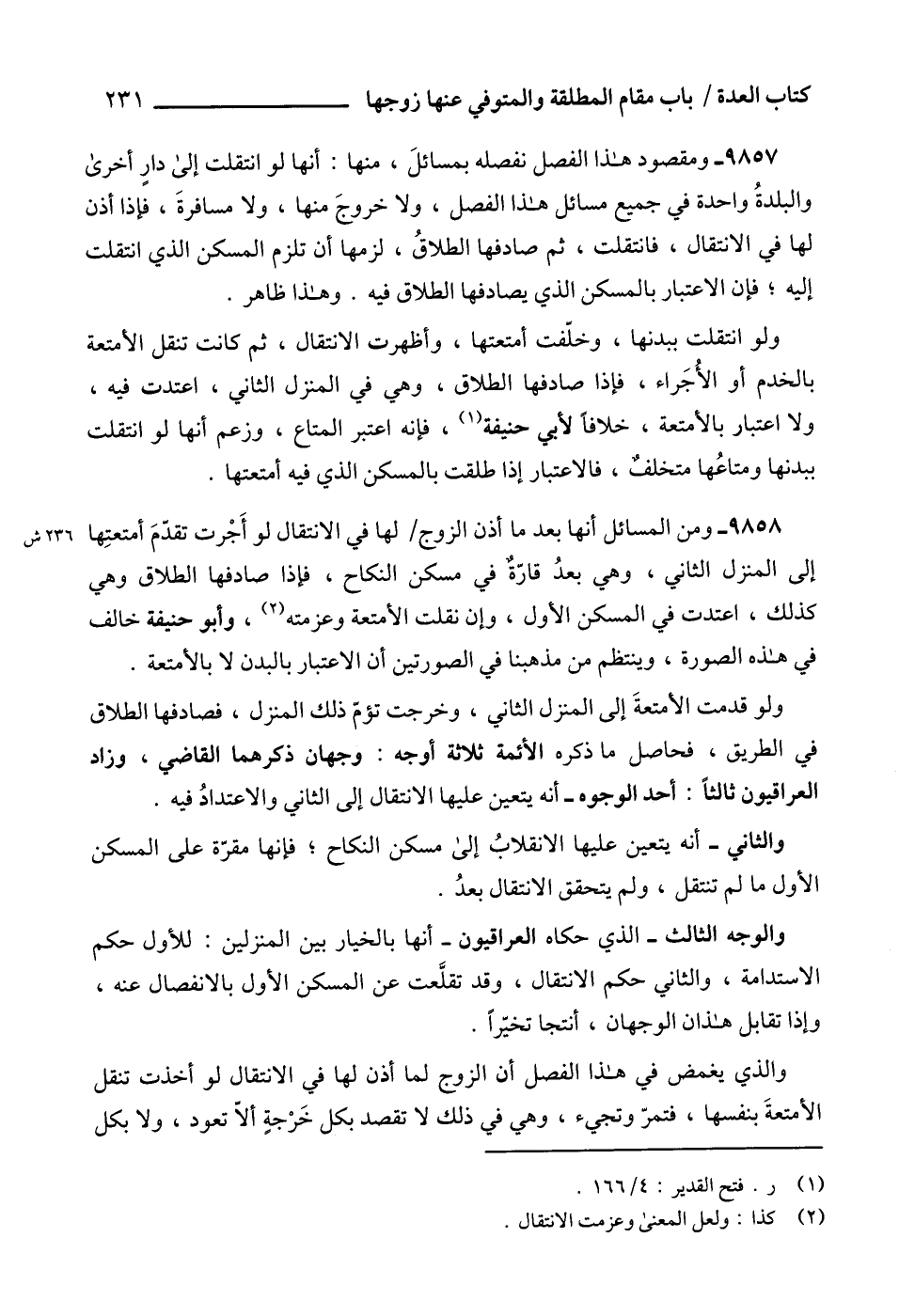 9858 - ومن المسائل أنها بعد ما أذن الزوج لها في الانتقال لو أَجْرت تقدّمَ أمتعتِها إلى المنزل الثاني، وهي بعدُ قارّةٌ في مسكن النكاح، فإذا صادفها الطلاق وهي كذلك، اعتدت في المسكن الأول، وإن نقلت الأمتعة وعزمته (2)، وأبو حنيفة خالف في هذه الصورة، وينتظم من مذهبنا في الصورتين أن الاعتبار بالبدن لا بالأمتعة.