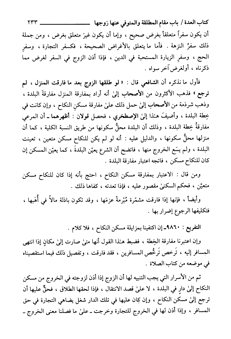 فأول ما نذكره أن الشافعي قال: " لو طلقها الزوج بعد ما فارقت المنزل، لم ترجع " فذهب الأكثرون من الأصحاب إلى أنه أراد بمفارقة المنزل مفارقةَ البلدة، وذهب شرذمة من الأصحاب إلى حمل ذلك على مفارقة مسكنِ النكاح، وإن كانت في خِطة البلدة، وأضيفَ هذا إلى الإصطخري، فحصل قولان: أظهرهما - أن المرعي مفارقةُ خِطة البلدة، وذلك أن البلدة محلُّ سكونها من طريق النسبة الكلية، كما أن منزلها محلُّ سكونها، والدليل عليه: أنه لو لم يكن للنكاح مسكن متعين، تعينت البلدة، ولم يسَع الخروج منها، فاتضح أن الشرع يعيّن البلدةَ، كما يعيّن المسكن إن كان للنكاح مسكن، فاتجه اعتبار مفارقة البلدة.
