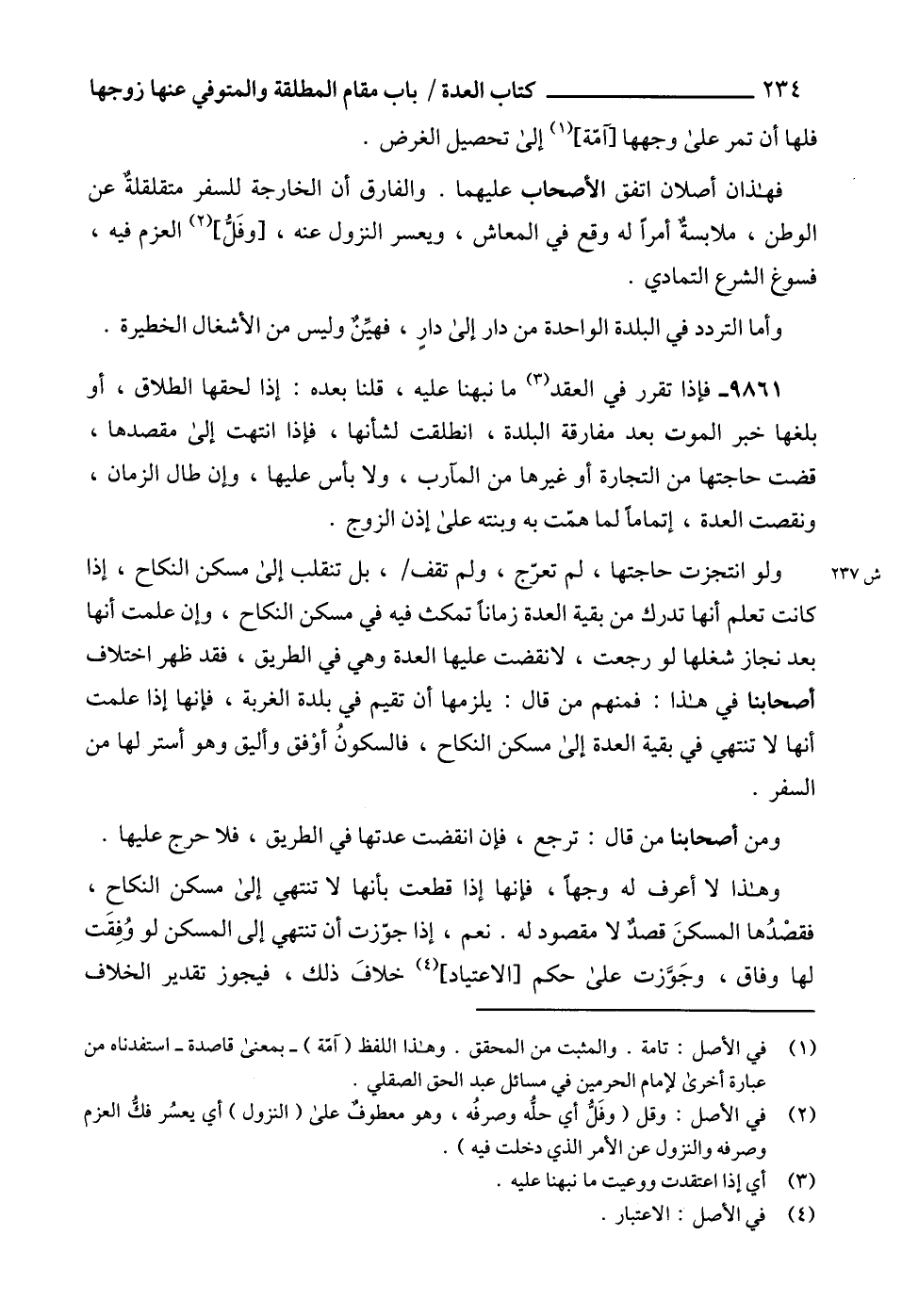 9861 - فإذا تقرر في العقد (3) ما نبهنا عليه، قلنا بعده: إذا لحقها الطلاق، أو بلغها خبر الموت بعد مفارقة البلدة، انطلقت لشأنها، فإذا انتهت إلى مقصدها، قضت حاجتها من التجارة أو غيرها من المآرب، ولا بأس عليها، وإن طال الزمان، ونقصت العدة، إتماماً لما همّت به وبنته على إذن الزوج.
