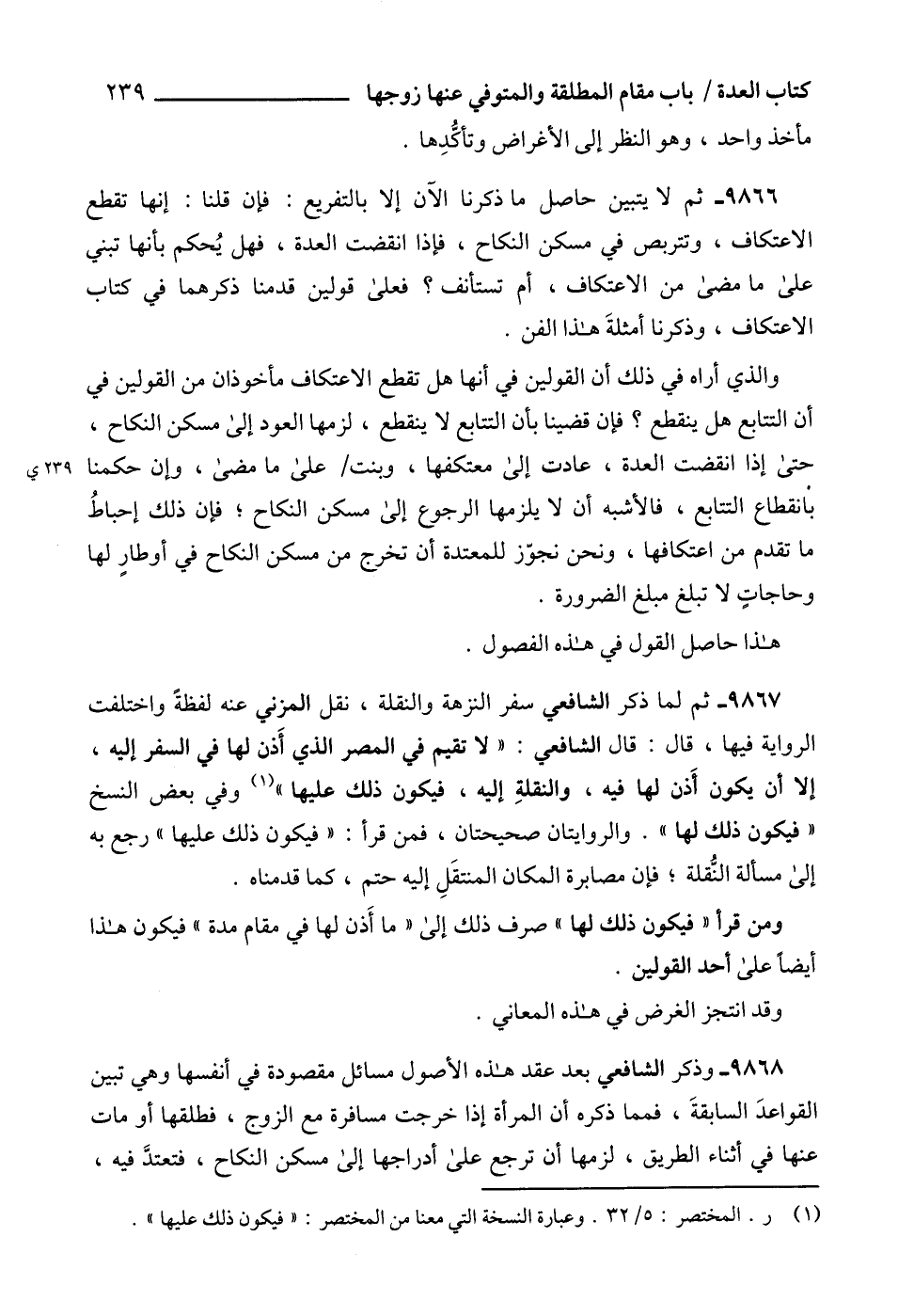 9868 - وذكر الشافعي بعد عقد هذه الأصول مسائل مقصودة في أنفسها وهي تبين القواعدَ السابقةَ، فمما ذكره أن المرأة إذا خرجت مسافرة مع الزوج، فطلقها أو مات عنها في أثناء الطريق، لزمها أن ترجع على أدراجها إلى مسكن النكاح، فتعتدَّ فيه،