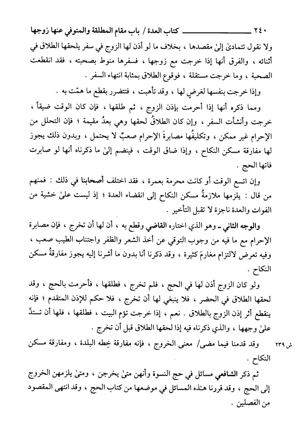 وإن اتسع الوقت أو كانت محرمة بعمرة، فقد اختلف أصحابنا في ذلك: فمنهم من قال: يلزمها ملازمةُ مسكن النكاح إلى انقضاء العدة؛ إذ ليست على خشية من الفوات والعدة ناجزة لا تقبل التأخير.