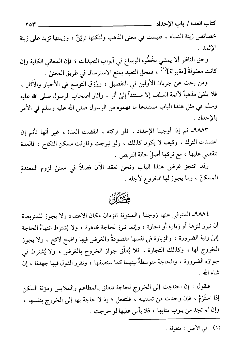 وقد انتجز غرض هذا الباب ونحن نعقد الآن فصلاً في معنى لزوم المعتدةِ المسكنَ، وما يجوز لها الخروج لأجله.