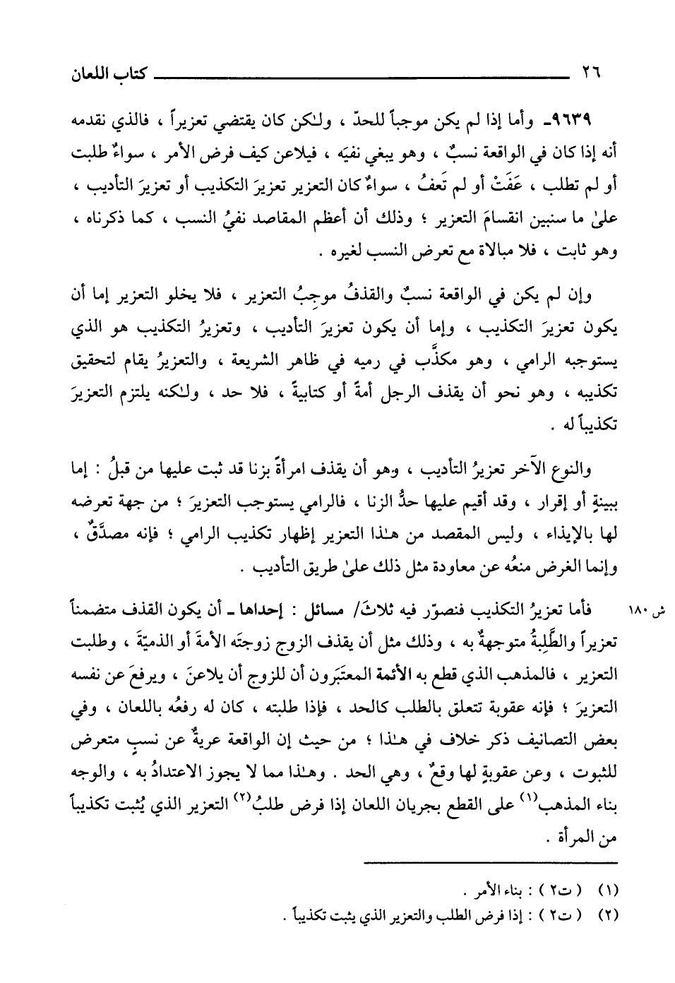 9639 - وأما إذا لم يكن موجباً للحدّ، ولكن كان يقتضي تعزيراً، فالذي نقدمه أنه إذا كان في الواقعة نسبٌ، وهو يبغي نفيَه، فيلاعن كيف فرض الأمر، سواءٌ طلبت أو لم تطلب، عَفَتْ أو لم تَعفُ، سواءٌ كان التعزير تعزيرَ التكذيب أو تعزيرَ التأديب، على ما سنبين انقسامَ التعزير؛ وذلك أن أعظم المقاصد نفيُ النسب، كما ذكرناه، وهو ثابت، فلا مبالاة مع تعرض النسب لغيره.