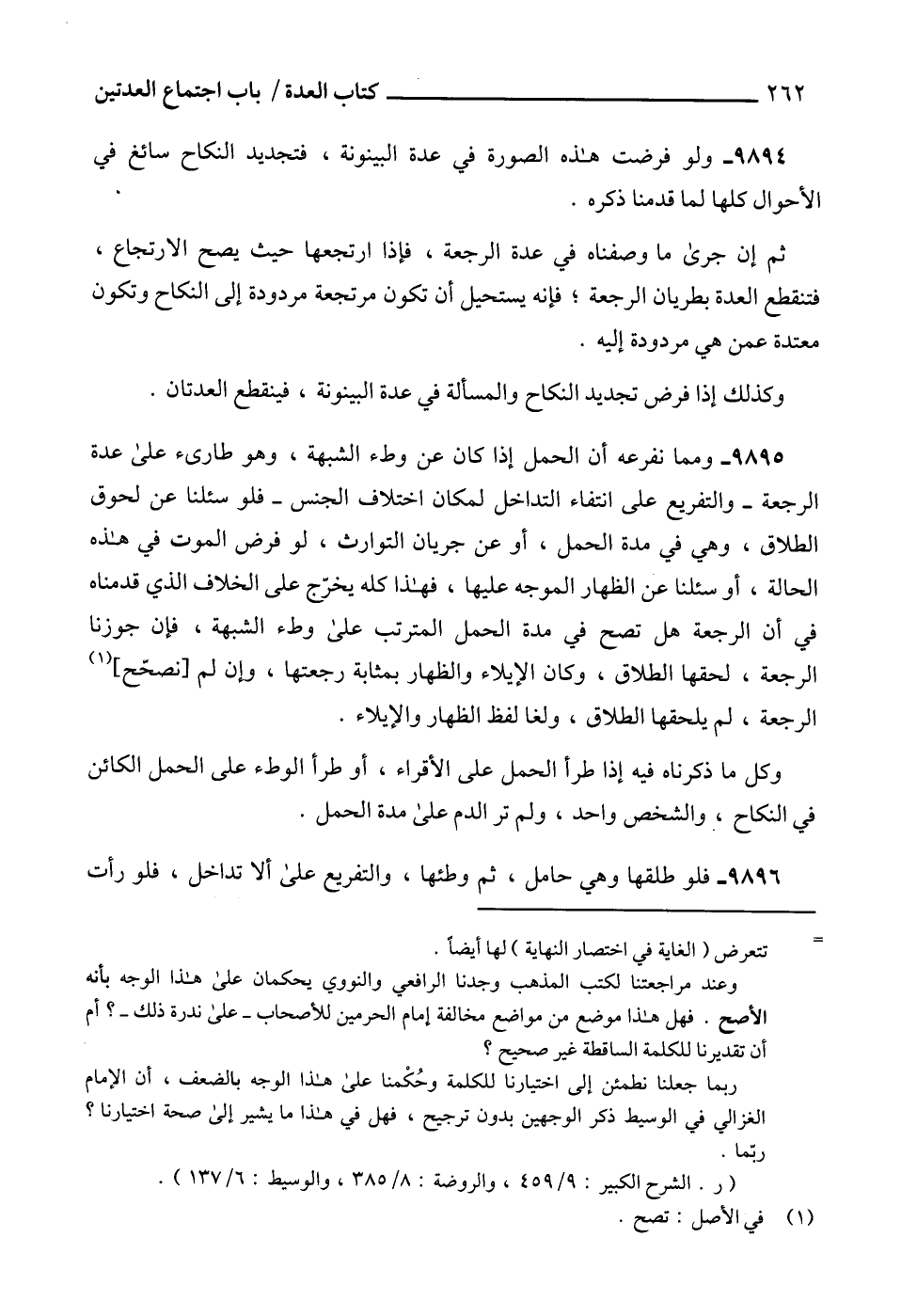 وعند مراجعتنا لكتب المذهب وجدنا الرافعي والنووي يحكمان على هذا الوجه بأنه الأصح. فهل هذا موضع من مواضع مخالفة إمام الحرمين للأصحاب -على ندرة ذلك-؟ أم أن تقديرنا للكلمة الساقطة غير صحيح؟