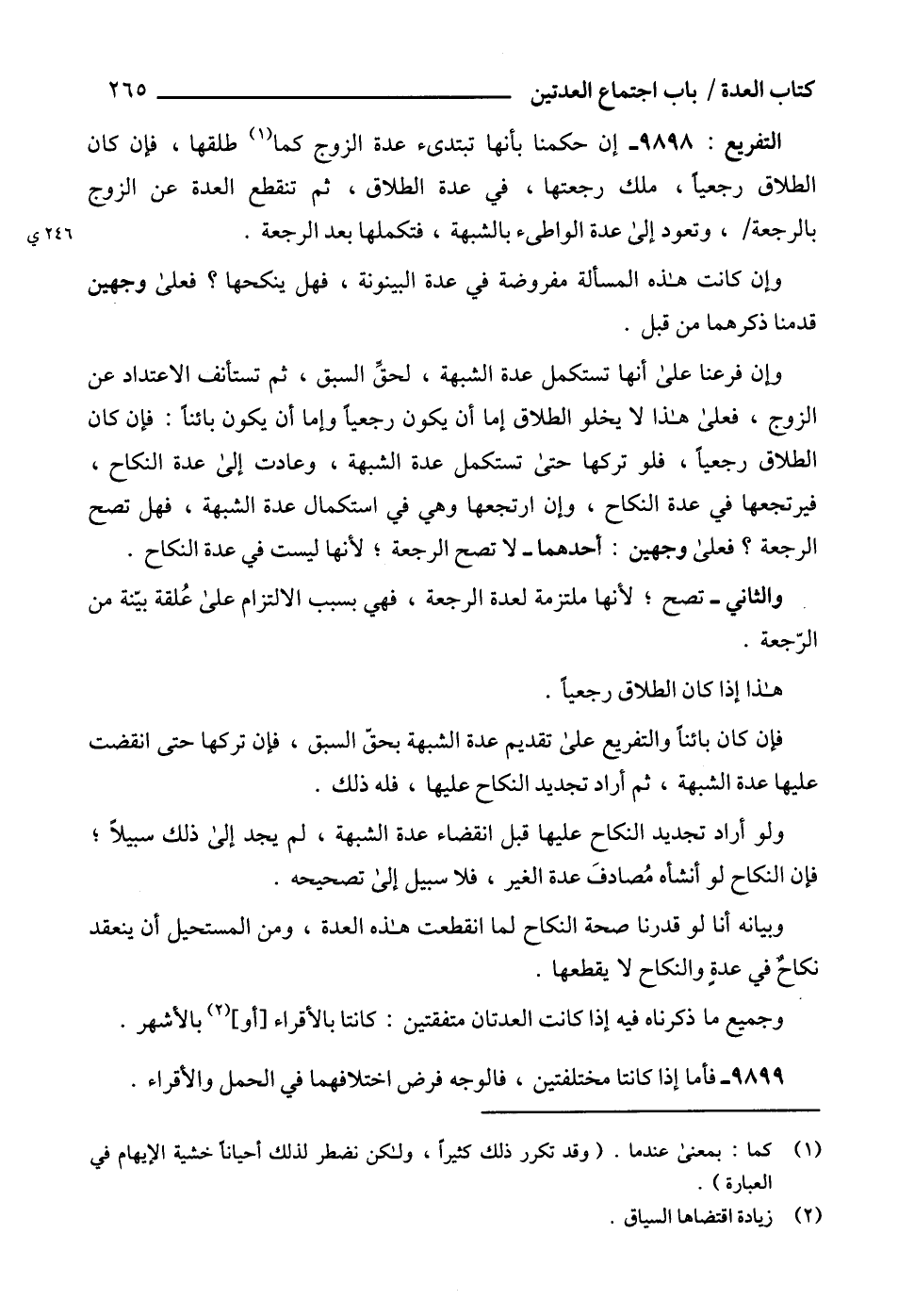 9898 - إن حكمنا بأنها تبتدىء عدة الزوج كما (1) طلقها، فإن كان الطلاق رجعياً، ملك رجعتها، في عدة الطلاق، ثم تنقطع العدة عن الزوج بالرجعة، وتعود إلى عدة الواطىء بالشبهة، فتكملها بعد الرجعة.