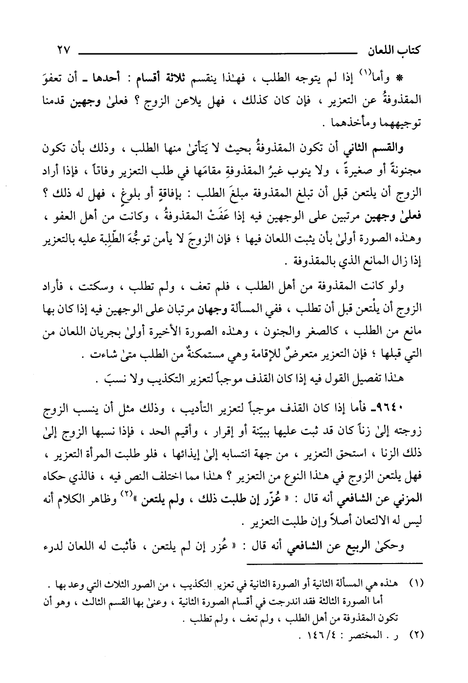 9640 - فأما إذا كان القذف موجباً لتعزير التأديب، وذلك مثل أن ينسب الزوج زوجته إلى زناً كان قد ثبت عليها ببيّنة أو إقرار، وأقيم الحد، فإذا نسبها الزوج إلى ذلك الزنا، استحق التعزير، من جهة انتسابه إلى إيذائها، فلو طلبت المرأة التعزير، فهل يلتعن الزوج في هذا النوع من التعزير؟ هذا مما اختلف النص فيه، فالذي حكاه المزني عن الشافعي أنه قال: " عُزّر إن طلبت ذلك، ولم يلتعن " (2) وظاهر الكلام أنه ليس له الالتعان أصلاً وإن طلبت التعزير.