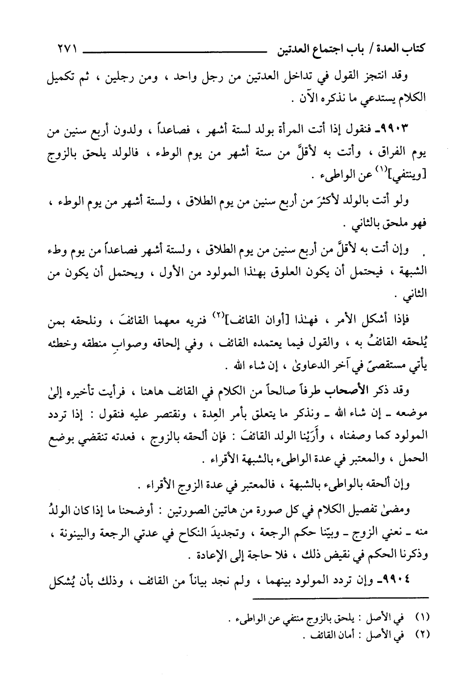 9903 - فنقول إذا أتت المرأة بولد لستة أشهر، فصاعداً، ولدون أربع سنين من يوم الفراق، وأتت به لأقلَّ من ستة أشهر من يوم الوطء، فالولد يلحق بالزوج [وينتفي] (1) عن الواطىء.