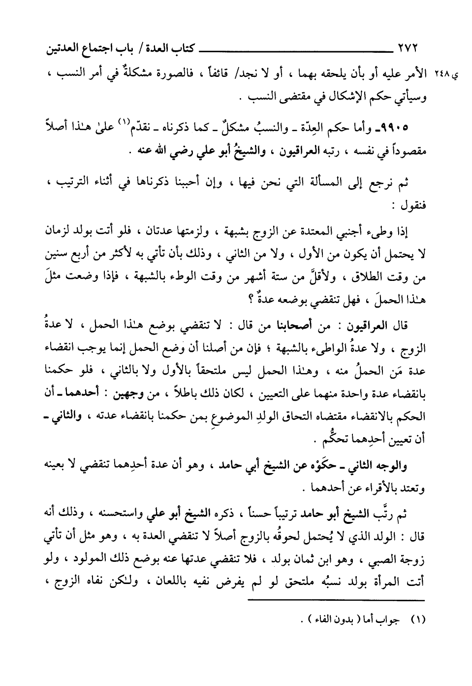 9905 - وأما حكم العِدّة -والنسبُ مشكلٌ- كما ذكرناه- نقدّم (1) على هذا أصلاً مقصوداً في نفسه، رتبه العراقيون، والشيخُ أبو علي رضي الله عنه.