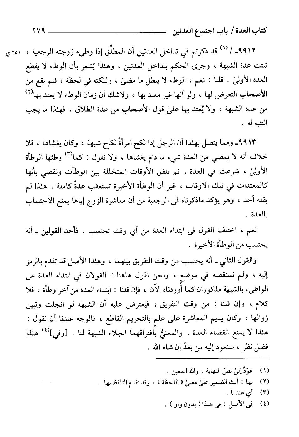 9912 - (1) قد ذكرتم في تداخل العدتين أن المطلِّق إذا وطىء زوجته الرجعية، ثبتت عدة الشبهة، وجرى الحكم بتداخل العدتين، وهذا يُشعر بأن الوطء لا يقطع العدة الأولى. قلنا: نعم، الوطء لا يبطل ما مضى، ولكنه في لحظة، فلم يقع من الأصحاب التعرض لها، ولو أنها غير معتد بها، ولا شك أن زمان الوطء لا يعتد بها (2) من عدة الشبهة، ولا يُعتد بها على قول الأصحاب من عدة الطلاق، فهذا ما يجب التنبه له.