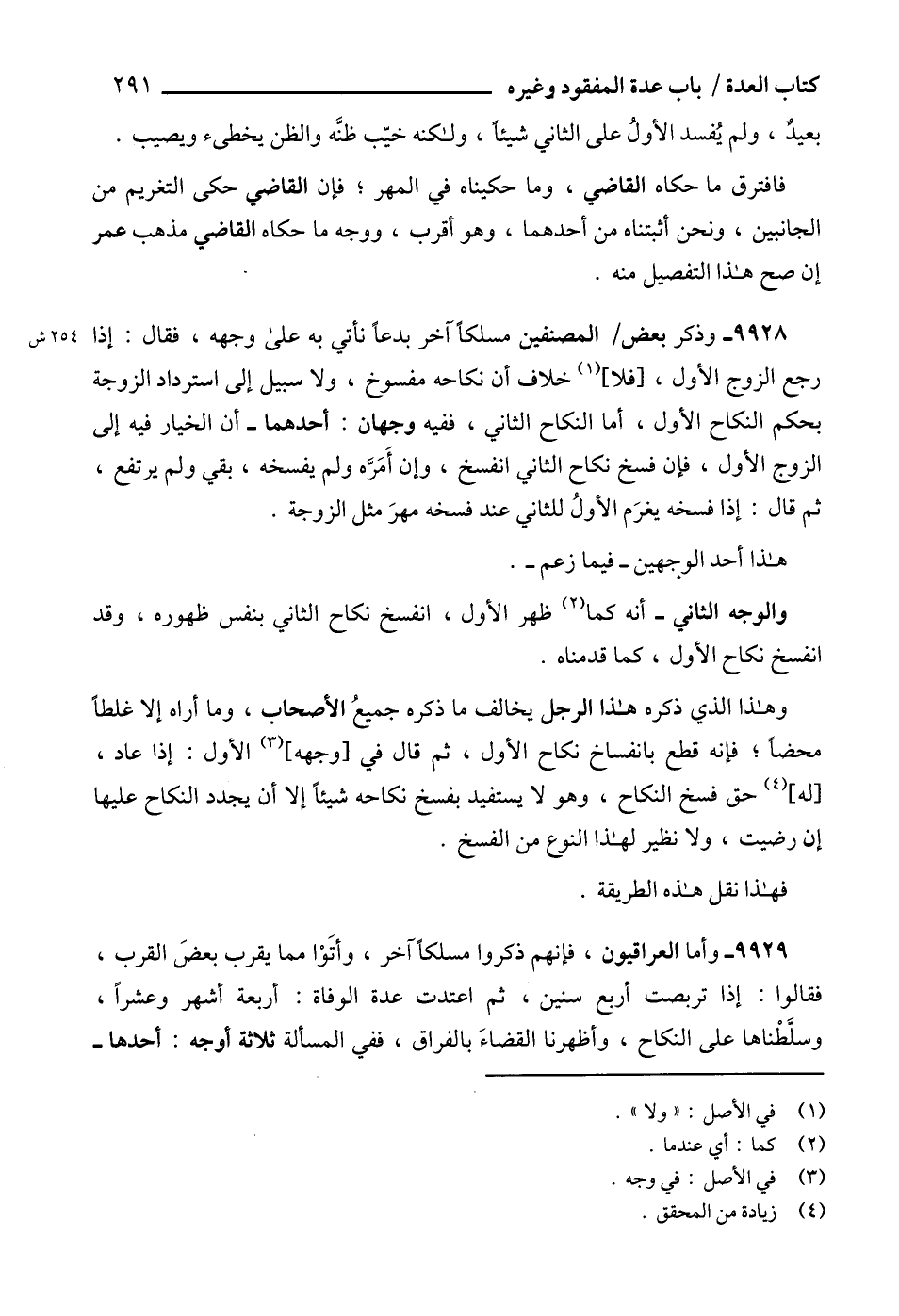 9929 - وأما العراقيون، فإنهم ذكروا مسلكاً آخر، وأتَوْا مما يقرب بعضَ القرب، فقالوا: إذا تربصت أربع سنين، ثم اعتدت عدة الوفاة: أربعة أشهر وعشراً، وسلَّطْناها على النكاح، وأظهرنا القضاءَ بالفراق، ففي المسألة ثلاثة أوجه: أحدها -