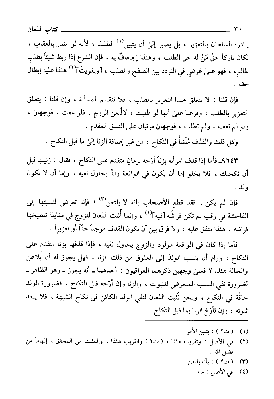فإن لم يكن، فقد قطع الأصحاب بأنه لا يلتعن (3)؛ فإنه تعرض لنسبتها إلى الفاحشة في وقتٍ لم تكن فراشَه [فيه] (4)، وإنما أُثبت اللعان للزوج في مقابلة تلطيخها فراشه. هذا متفق عليه، ولا فرق بين أن يكون القذف موجباً حدّاً أو تعزيراً.
