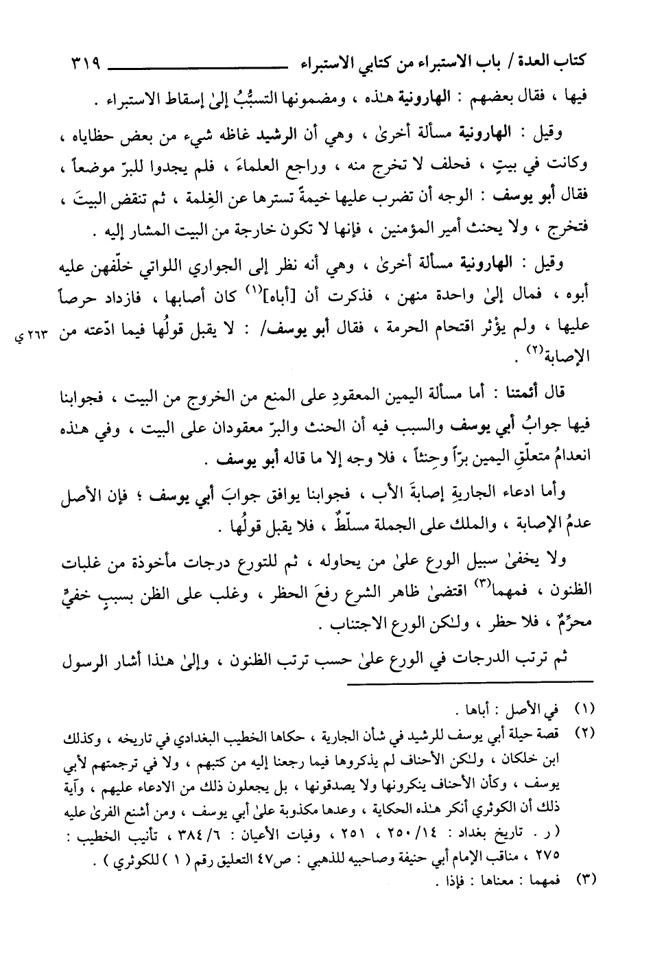 (2) قصة حيلة أبي يوسف للرشيد في شأن الجارية، حكاها الخطيب البغدادي في تاريخه، وكذلك ابن خلكان، ولكن الأحناف لم يذكروها فيما رجعنا إليه من كتبهم، ولا في ترجمتهم لأبي يوسف، وكأن الأحناف ينكرونها ولا يصدقونها، بل يجعلون ذلك من الادعاء عليهم، وآية ذلك أن الكوثري أنكر هذه الحكاية، وعدها مكذوبة على أبي يوسف، ومن أشنع الفرى عليه (ر. تاريخ بغداد: 14/ 250، 251، وفيات الأعيان: 6/ 384، تأنيب الخطيب: 275، مناقب الإمام أبي حنيفة وصاحبيه للذهبي: ص 47 التعليق رقم (1) للكوثري).