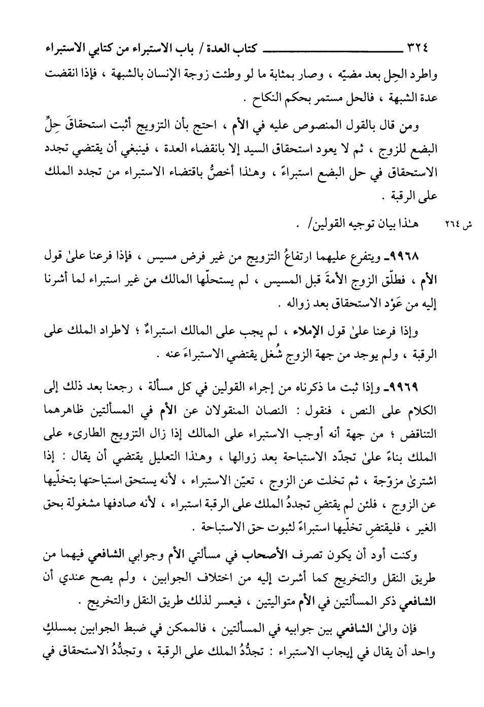 9969 - وإذا ثبت ما ذكرناه من إجراء القولين في كل مسألة، رجعنا بعد ذلك إلى الكلام على النص، فنقول: النصان المنقولان عن الأم في المسألتين ظاهرهما التناقض؛ من جهة أنه أوجب الاستبراء على المالك إذا زال التزويج الطارىء على الملك بناءً على تجدّد الاستباحة بعد زوالها، وهذا التعليل يقتضي أن يقال: إذا اشترى مزوّجة، ثم تخلت عن الزوج، تعيّن الاستبراء، لأنه يستحق استباحتها بتخلّيها عن الزوج، فلئن لم يقتضِ تجددُ الملك على الرقبة استبراء، لأنه صادفها مشغولة بحق الغير، فليقتضِ تخلّيها استبراءً لثبوت حق الاستباحة.