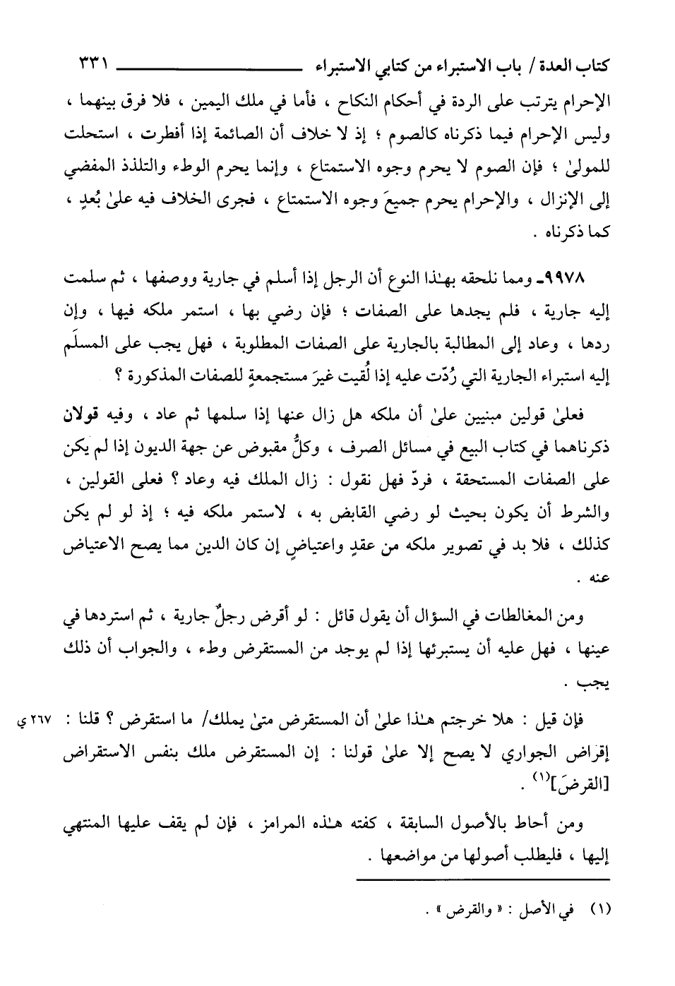 ومن المغالطات في السؤال أن يقول قائل: لو أقرض رجلٌ جارية، ثم استردها في عينها، فهل عليه أن يستبرئها إذا لم يوجد من المستقرض وطء، والجواب أن ذلك يجب.