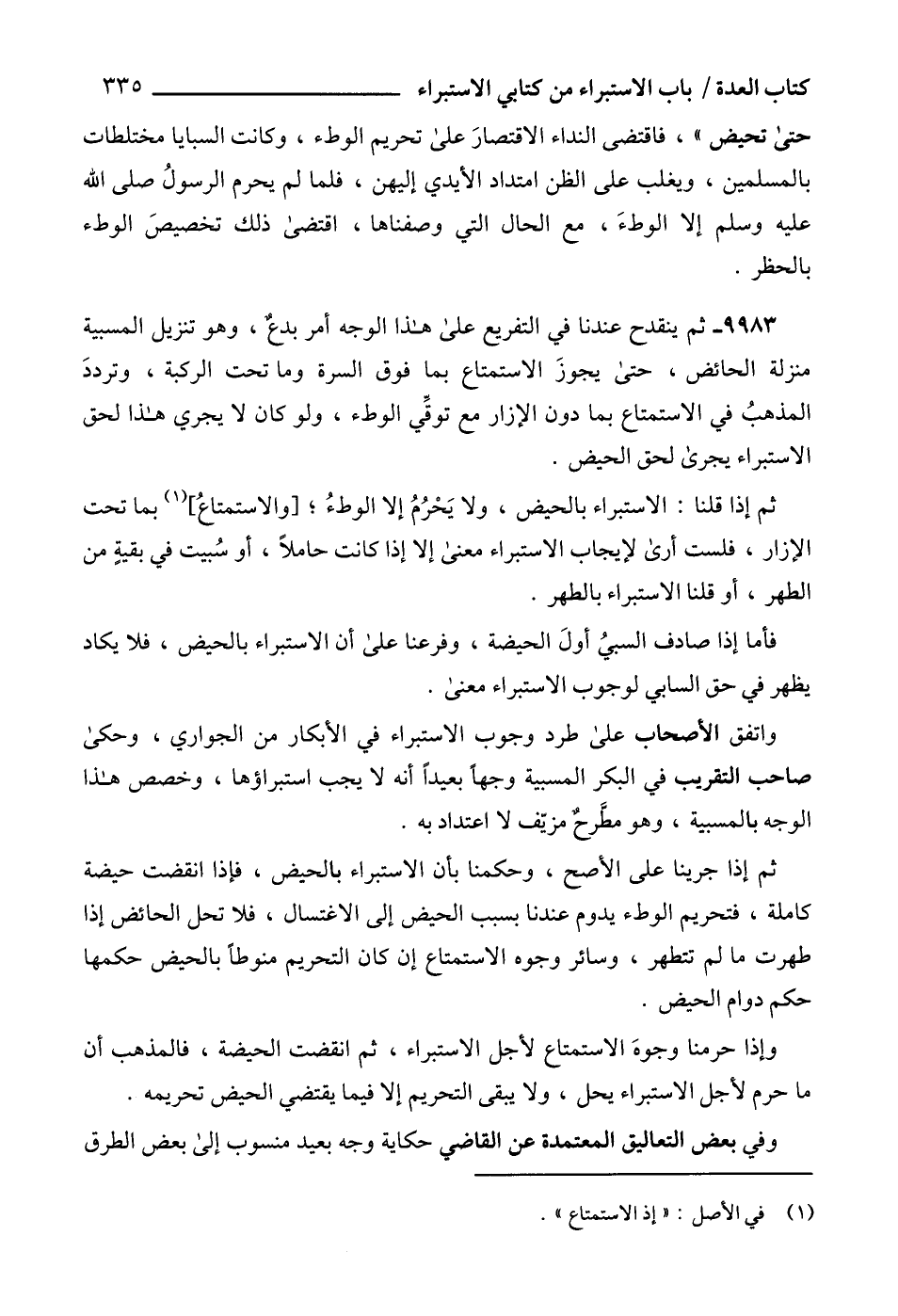 9983 - ثم ينقدح عندنا في التفريع على هذا الوجه أمر بدعٌ، وهو تنزيل المسبية منزلة الحائض، حتى يجوزَ الاستمتاع بما فوق السرة وما تحت الركبة، وترددَ المذهبُ في الاستمتاع بما دون الإزار مع توقِّي الوطء، ولو كان لا يجري هذا لحق الاستبراء يجرى لحق الحيض.