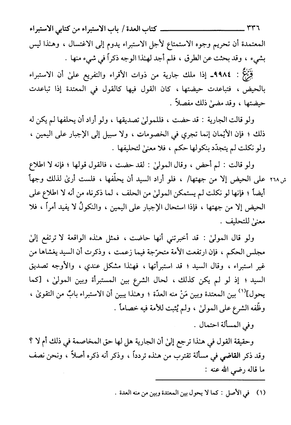 المعتمدة أن تحريم وجوه الاستمتاع لأجل الاستبراء يدوم إلى الاغتسال، وهذا ليس بشيء، وقد بحثت عن الطرق، فلم أجد لهذا الوجه ذكراً في شيء منها.